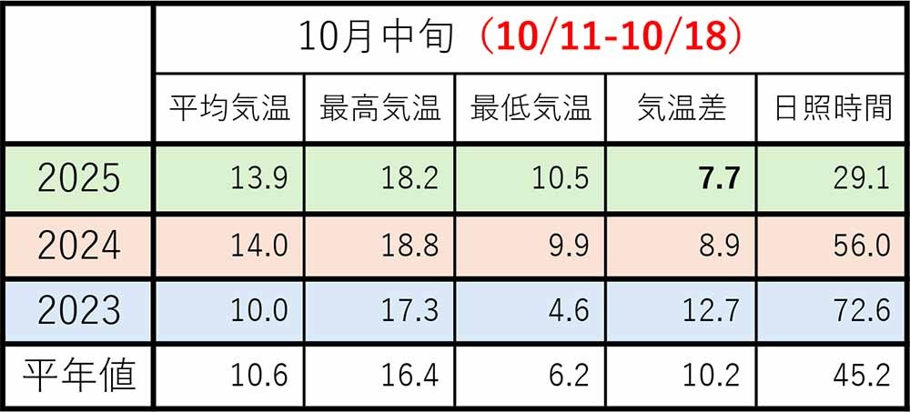 10月は昨年(2024)ほどではありませんが、平均気温が高く、特に朝晩の冷え込みがゆるいです。