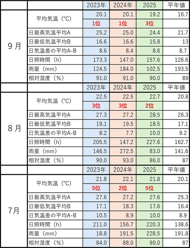 この3年(2023-2025)は軽井沢の気象観測(約100年)の中でも、飛びぬけて年間平均気温の高い年となっています。今年(2025)はまだ確定していませんが、年間の平均気温が9度台後半になる可能性が高く、そうなると2024年(10.1度)、2023年(10.0度)についで過去3番目に高くなることになります。※現在の3位は2018年の9.3度