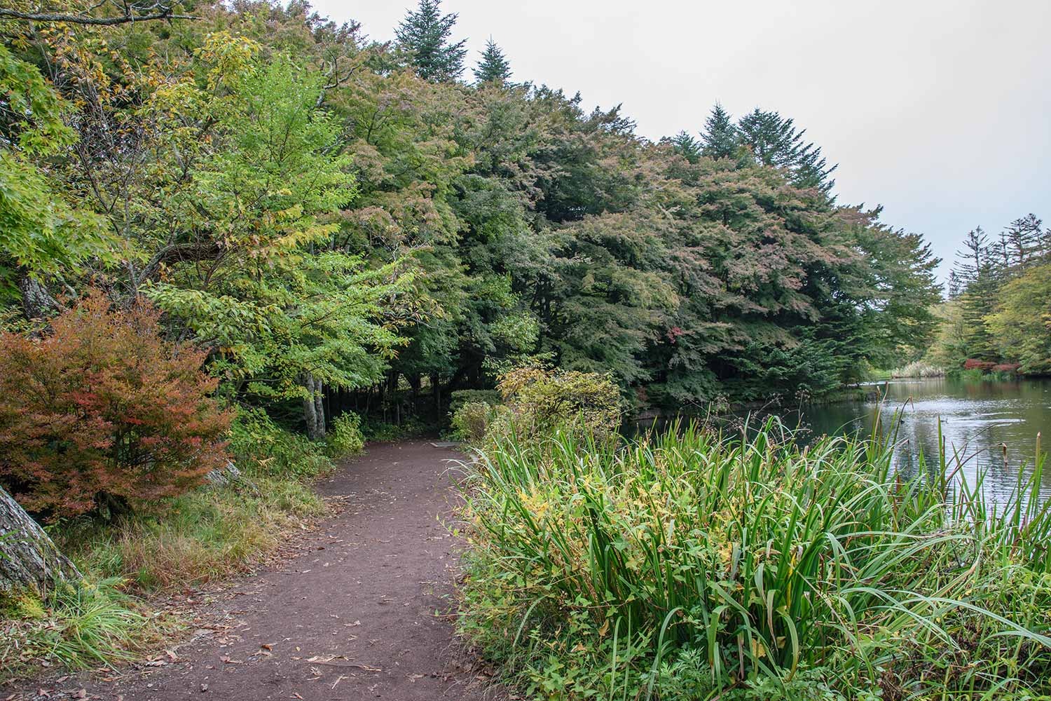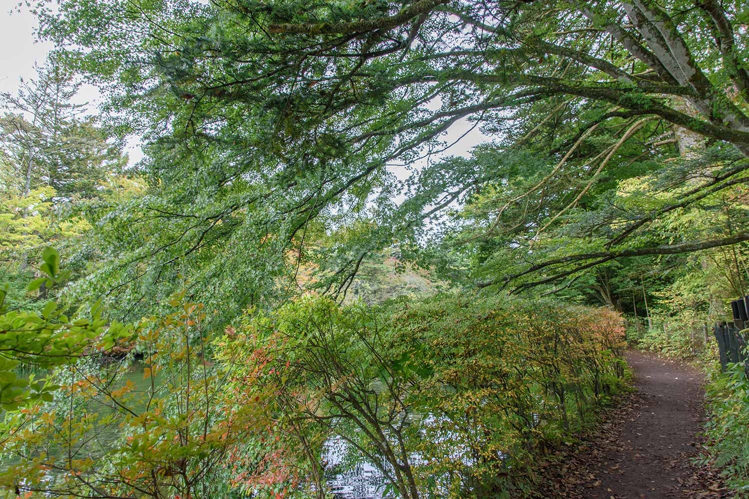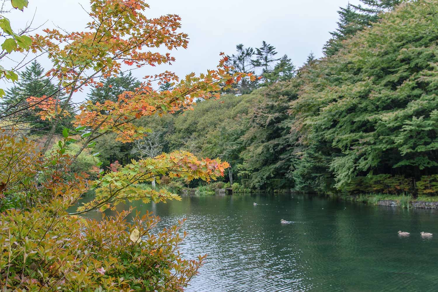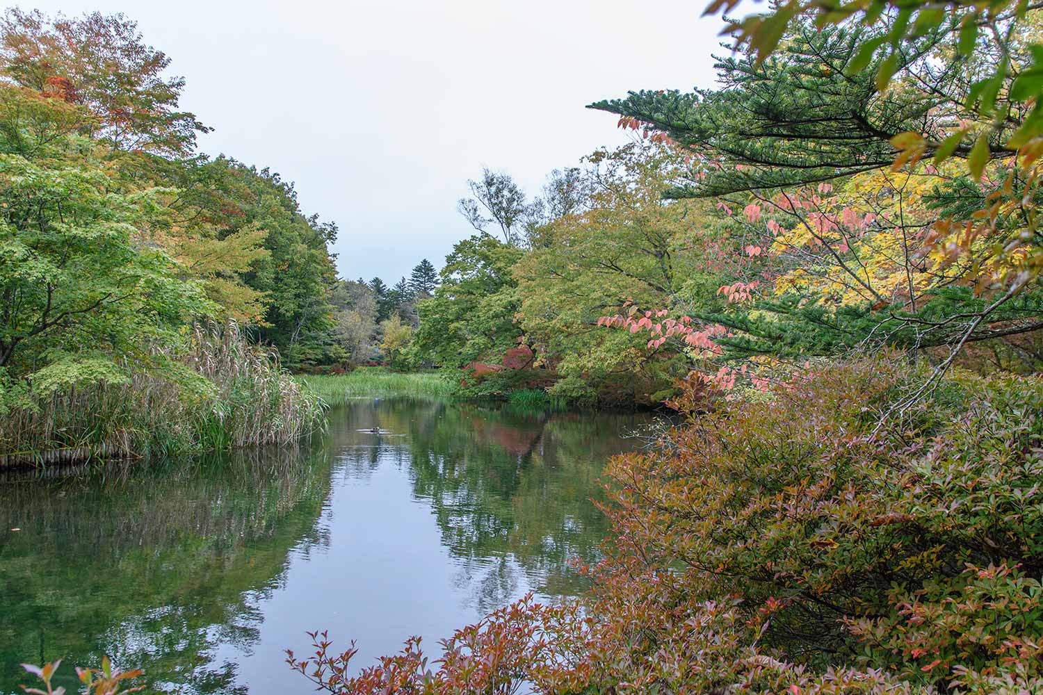 現在、雲場池の紅葉はようやく初期の彩りといったところ。10月に入ってから冷え込みのゆるい日が多く、日照時間も少ないことから、紅葉の進行は依然としてゆるやかです。