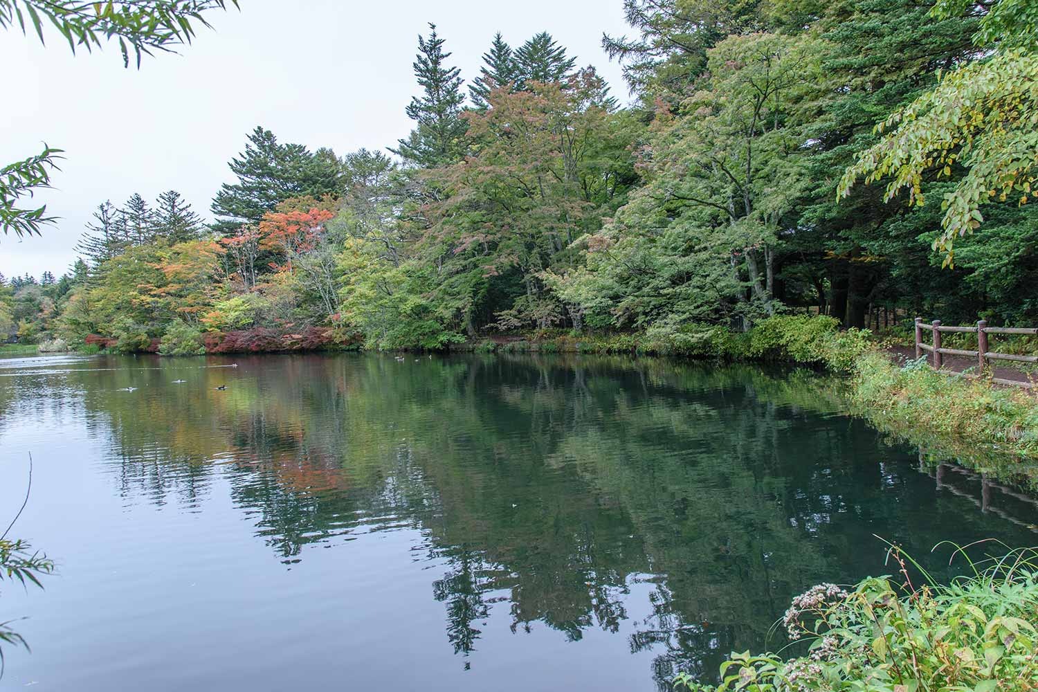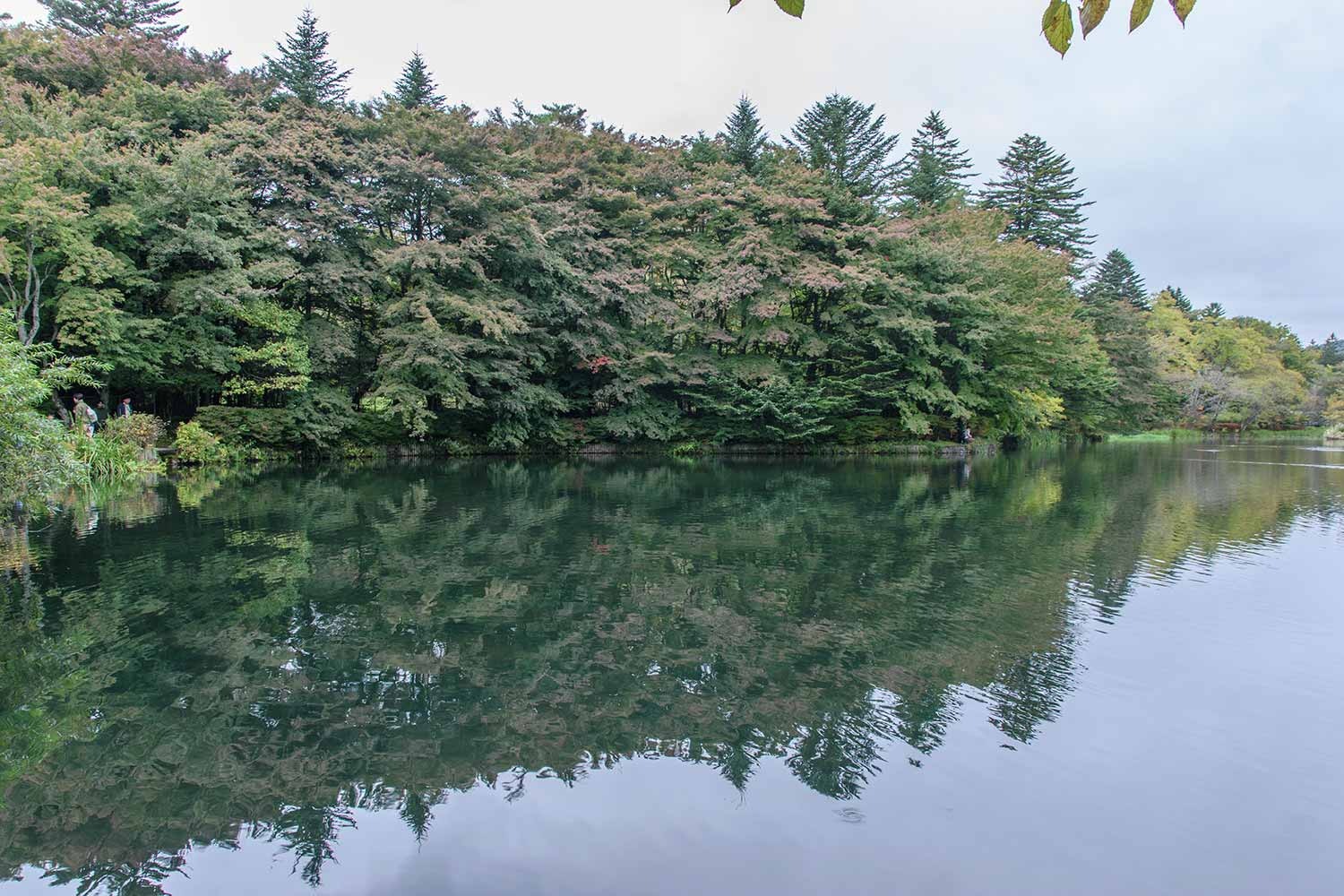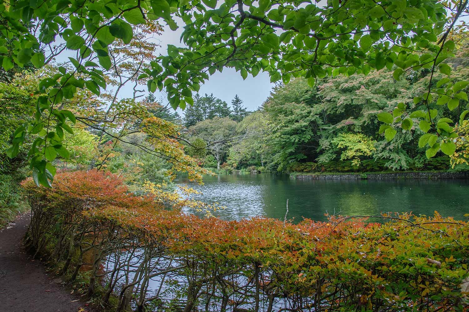 現在、雲場池の紅葉はようやく初期の彩りといったところ。10月に入ってから冷え込みのゆるい日が多く、日照時間も少ないことから、紅葉の進行は依然としてゆるやかです。
