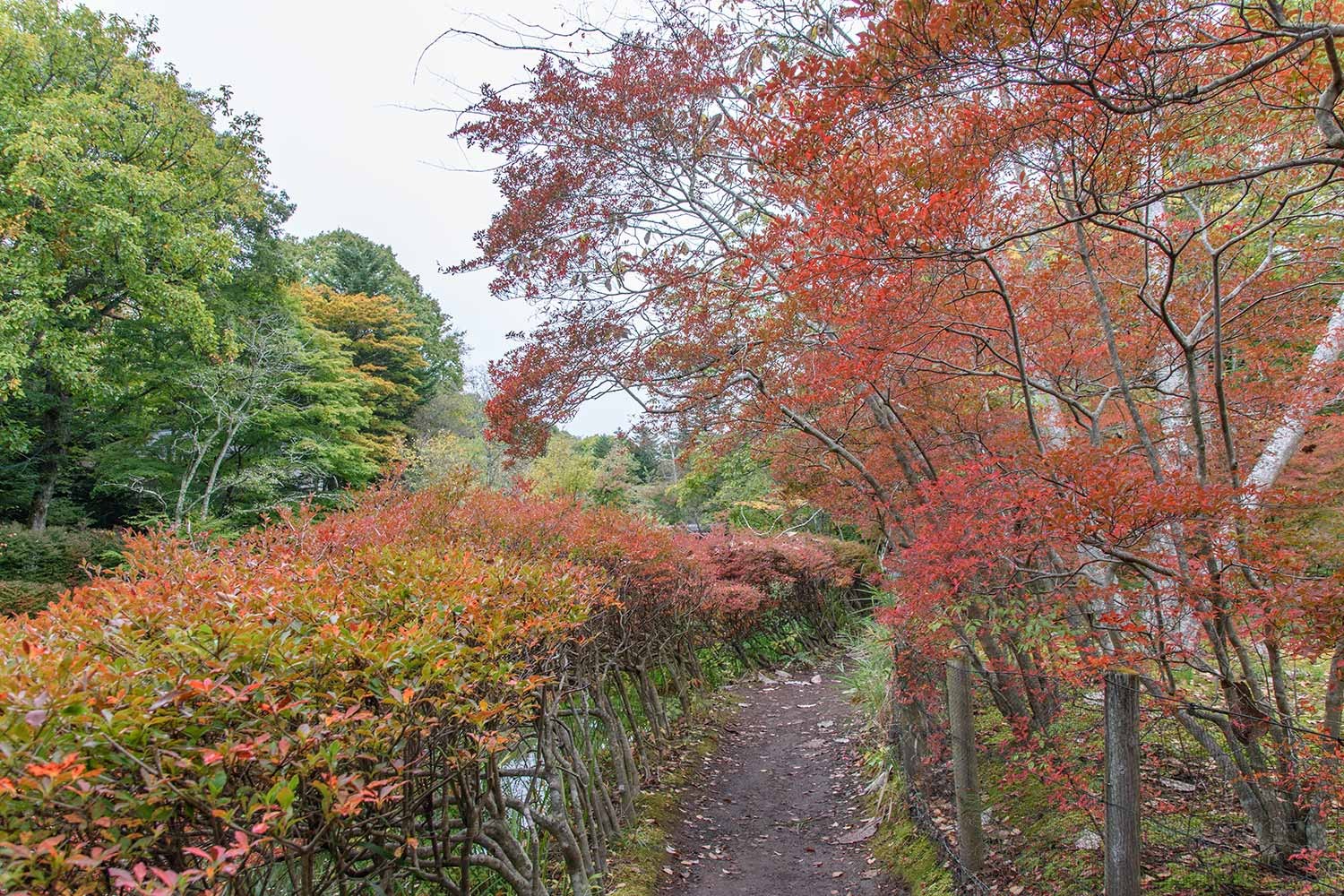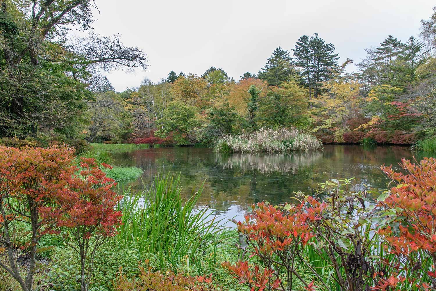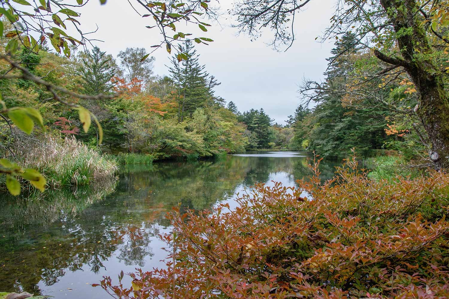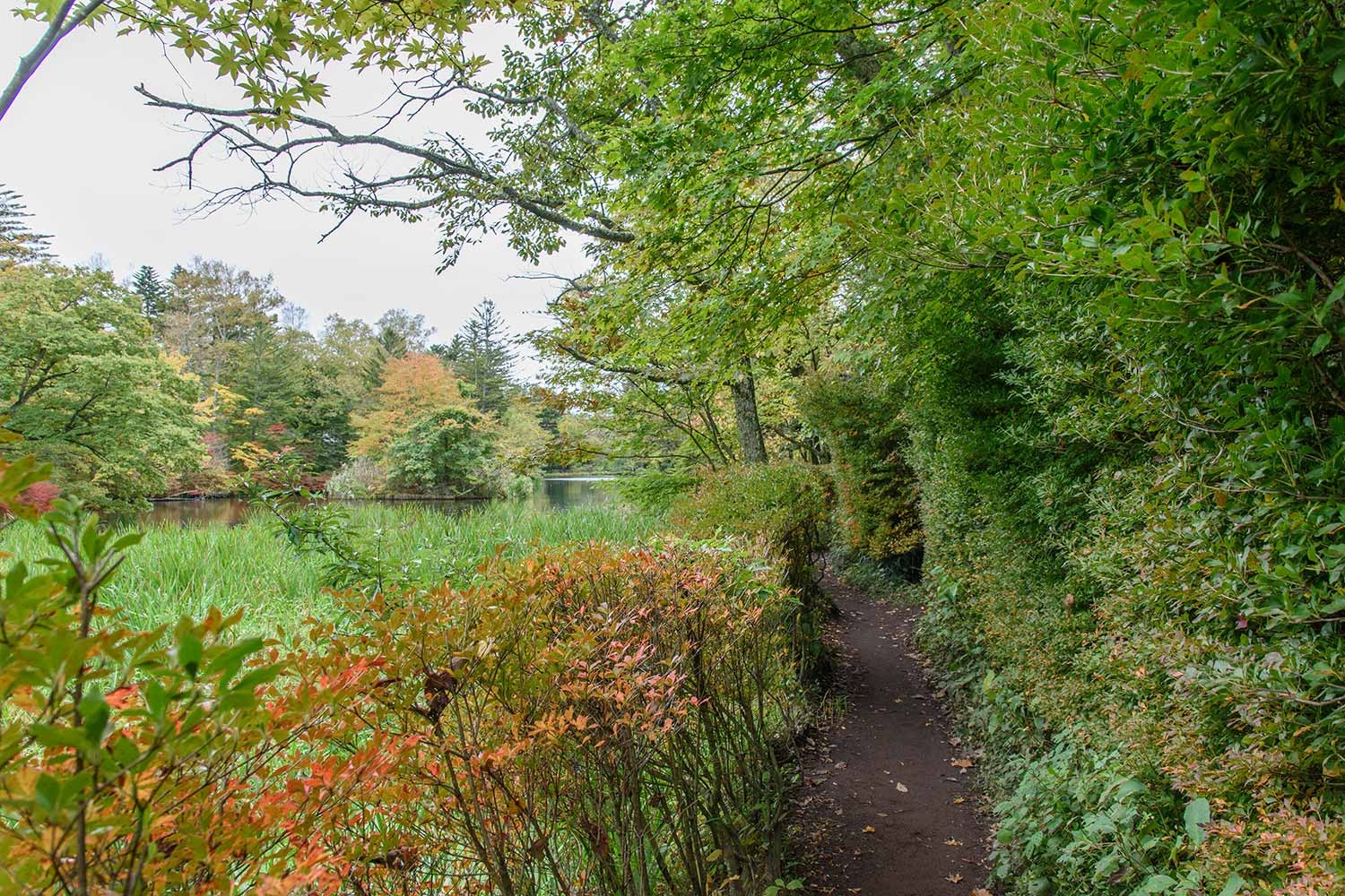 現在、雲場池の紅葉はようやく初期の彩りといったところ。10月に入ってから冷え込みのゆるい日が多く、日照時間も少ないことから、紅葉の進行は依然としてゆるやかです。