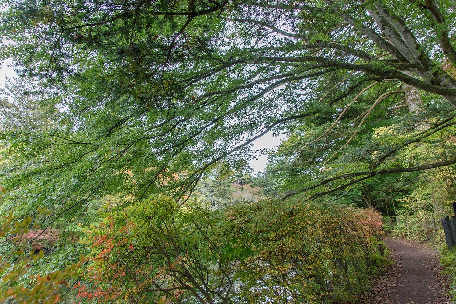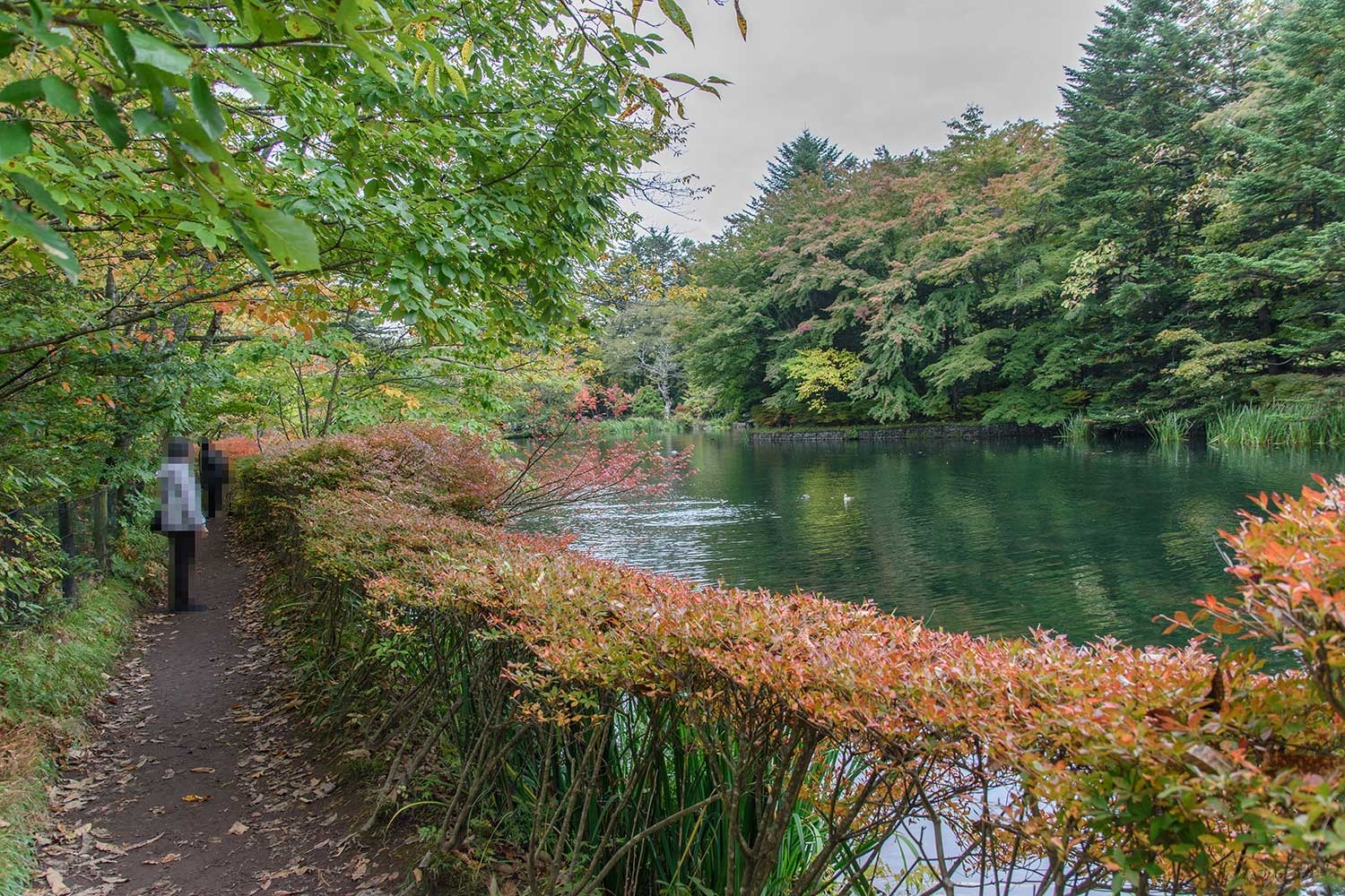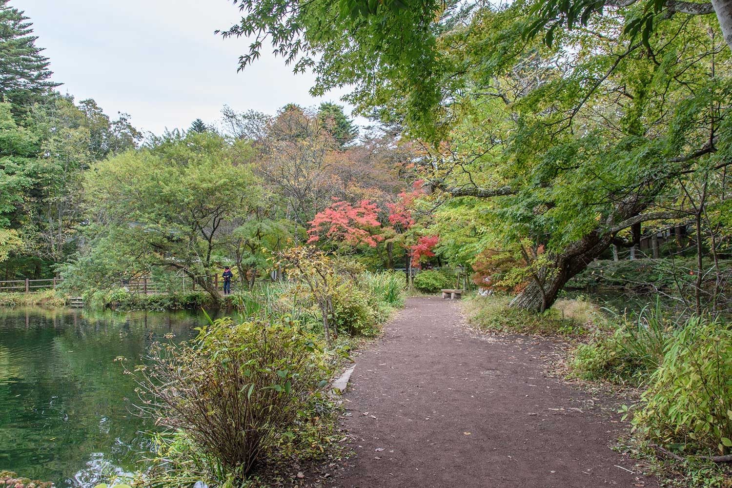 下写真:池の西側に連なるカエデ並木で雲場池の紅葉の見どころの一つ。例年であれば、紅葉の見ごろをむかえている時期ですが、今年はまだ初期の彩りといったところです。