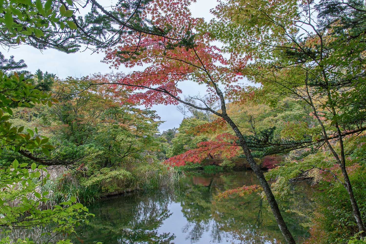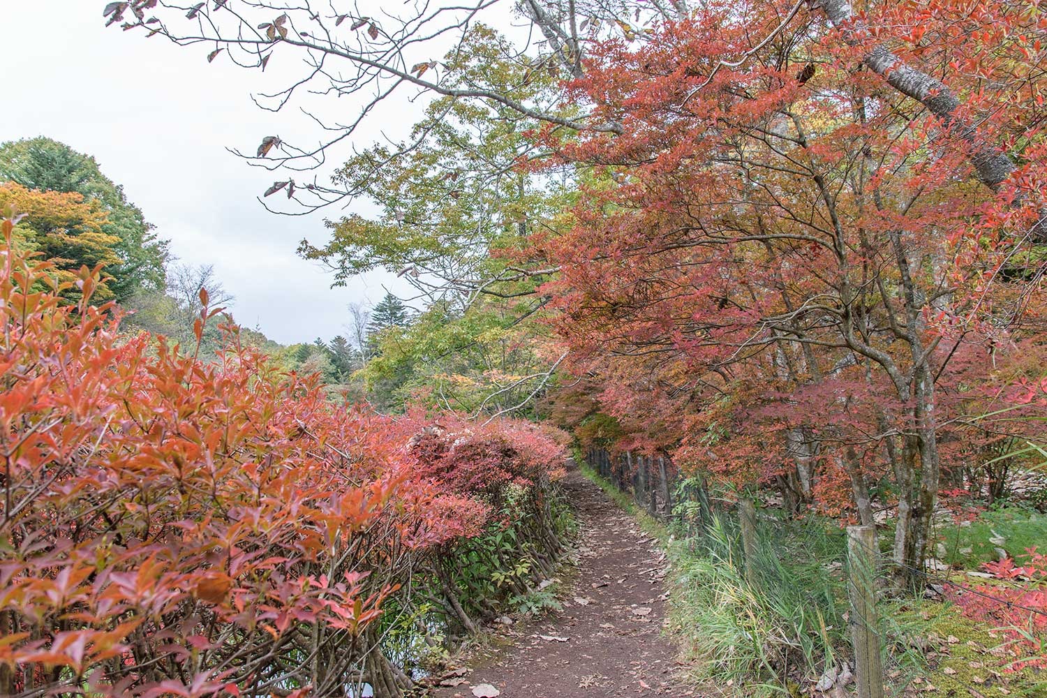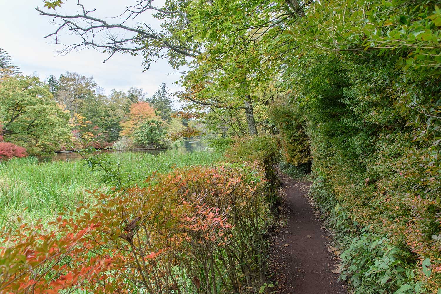下写真:池の西側に連なるカエデ並木で雲場池の紅葉の見どころの一つ。例年であれば、紅葉の見ごろをむかえている時期ですが、今年はまだ初期の彩りといったところです。