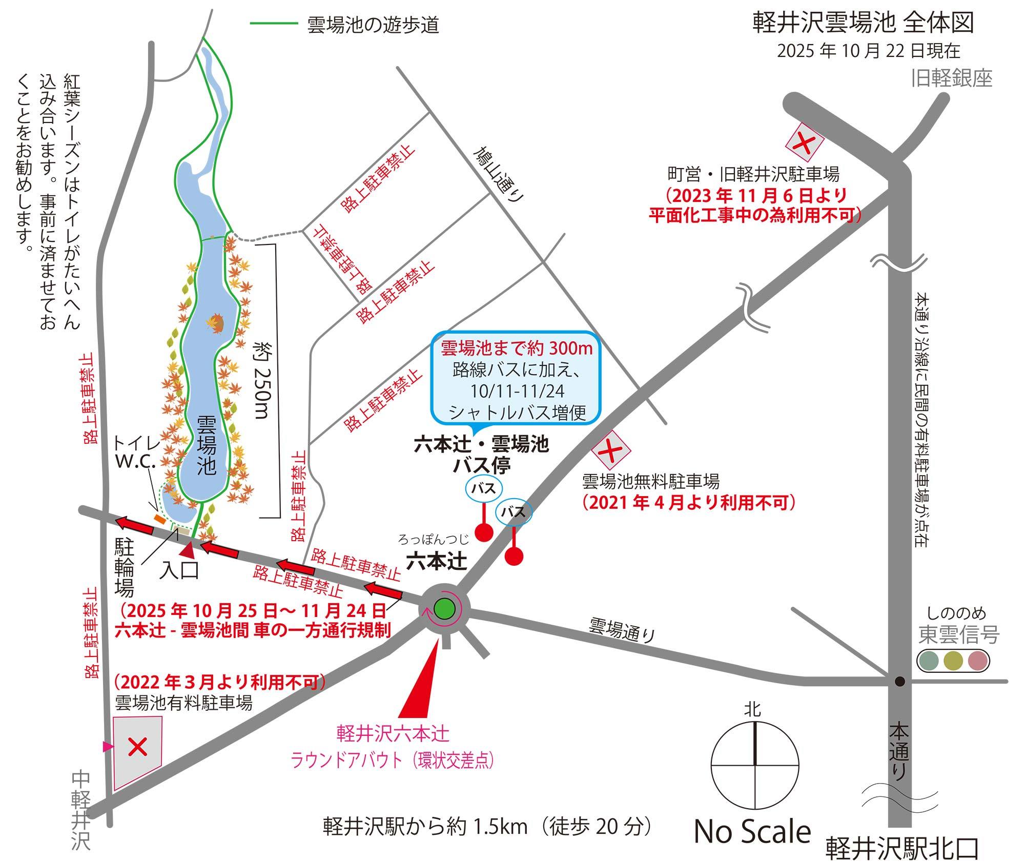 また、10月25日から11月24日の期間、雲場池の南側の道路で自動車の交通規制(一方通行)がありますので、ご注意ください。※交通規制、駐車場、シャトルバスについての情報を、このブログの少し先で案内しています。詳しくはそちらをご覧ください。