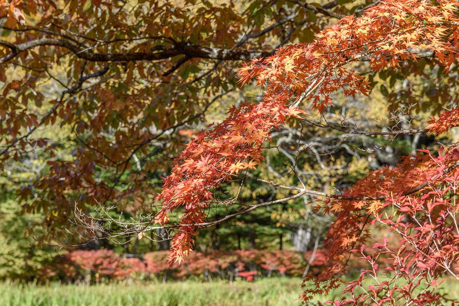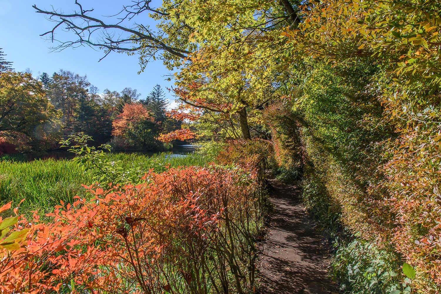 下写真:池の西側に連なるカエデ並木で雲場池の紅葉の見どころの一つ。ようやく見ごろ初期の状態になりましたが、今後さらに彩りを増していきます。