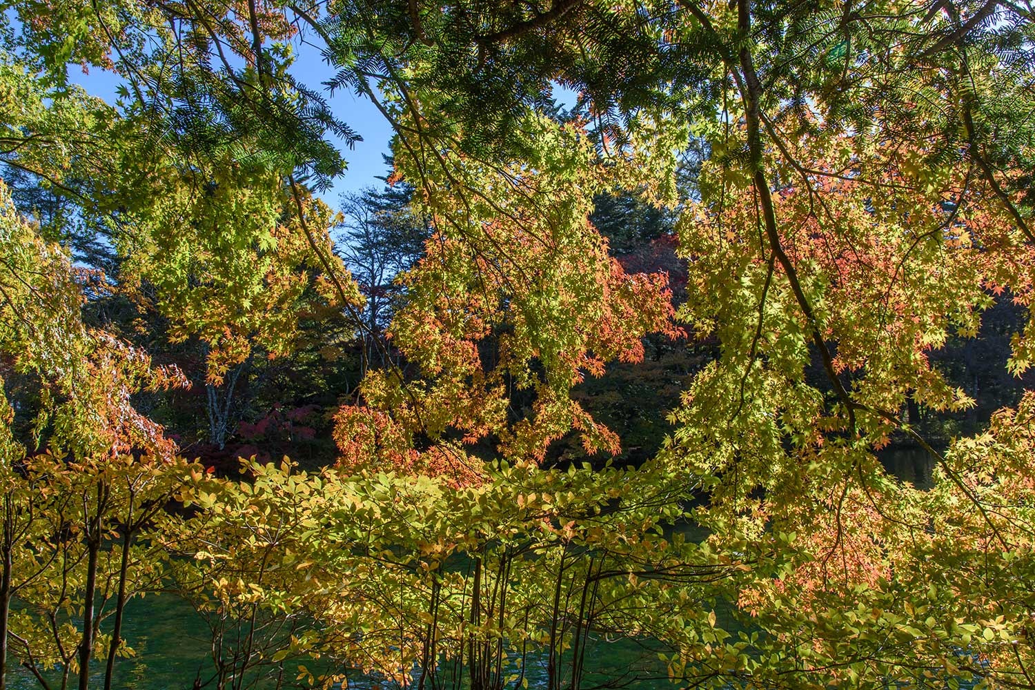 2025年10月29日 雲場池 イロハモミジの紅葉(所々で赤く色づいています)