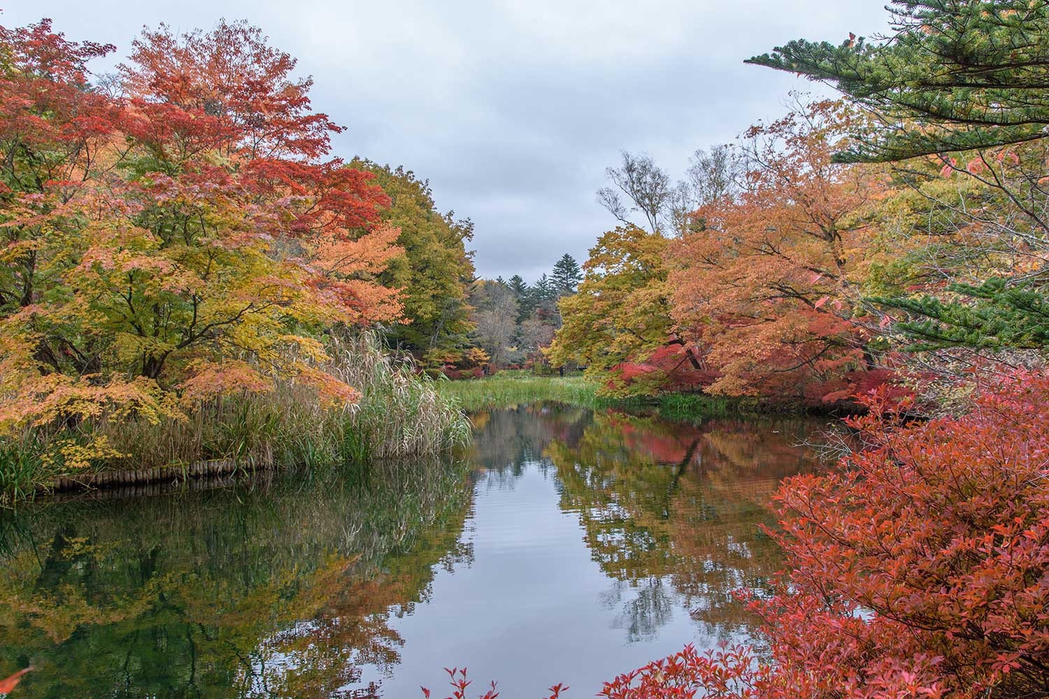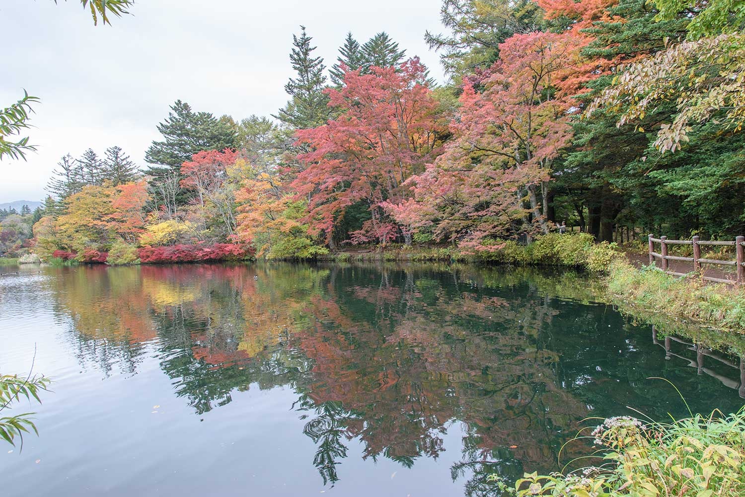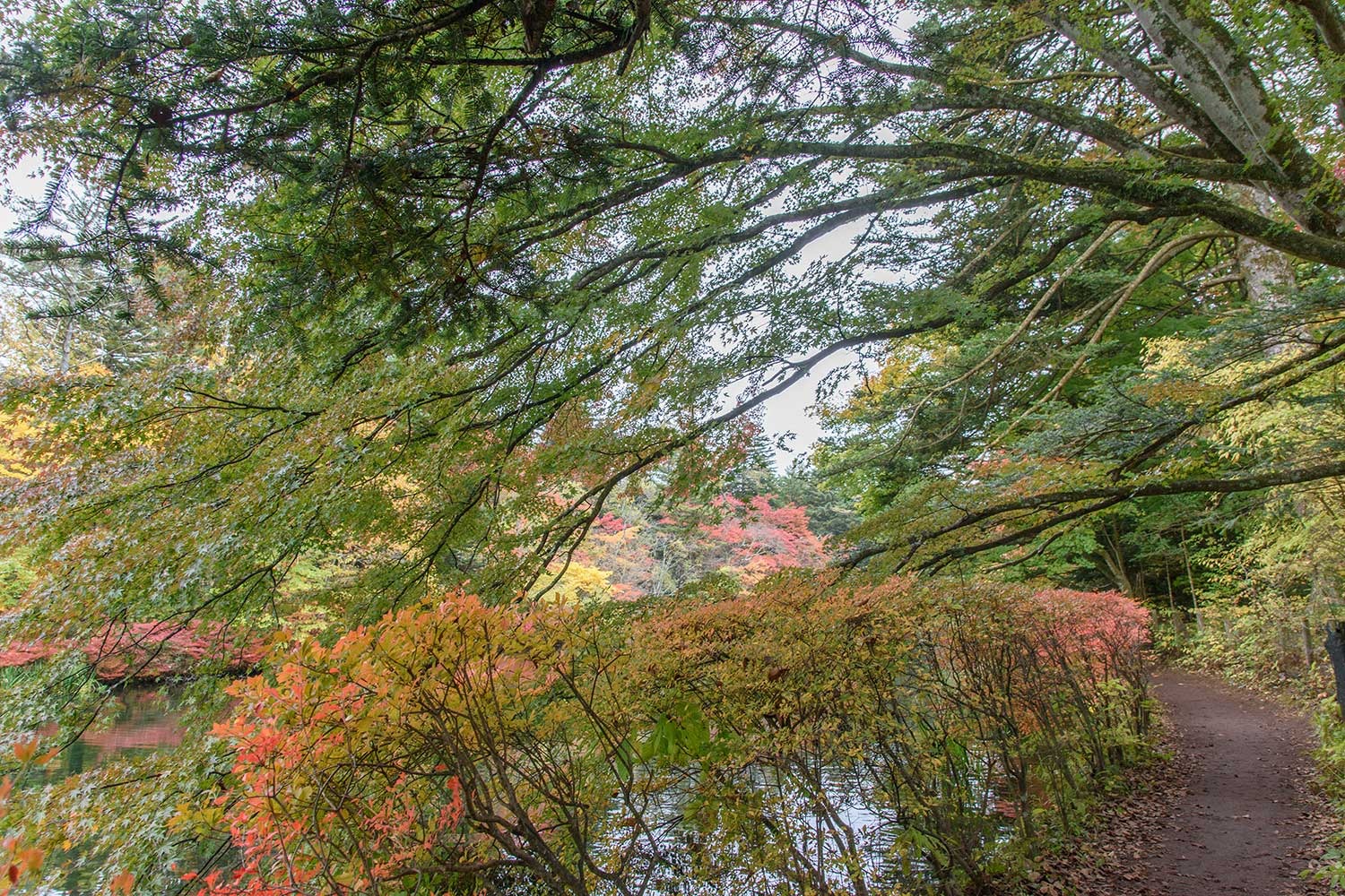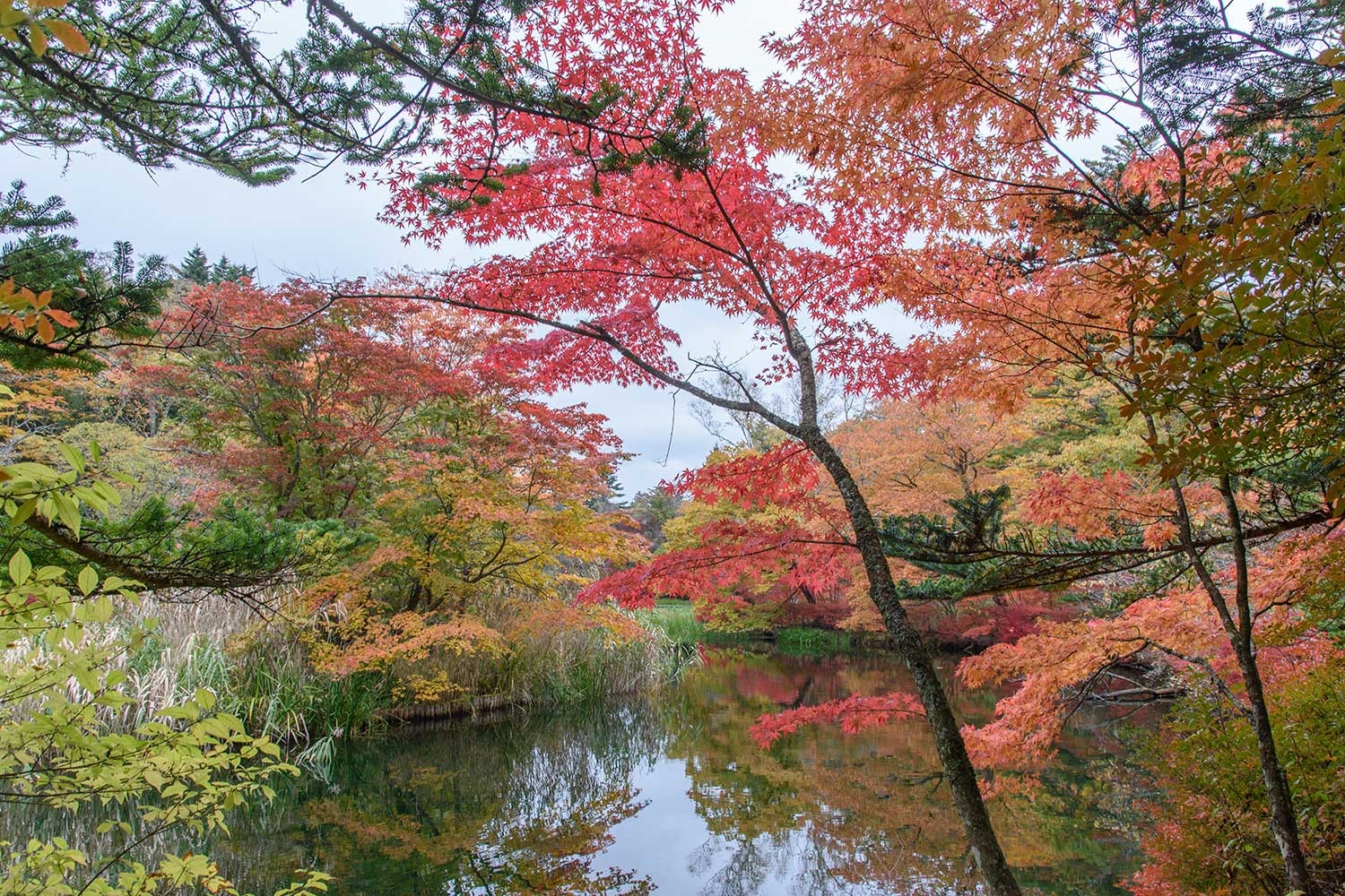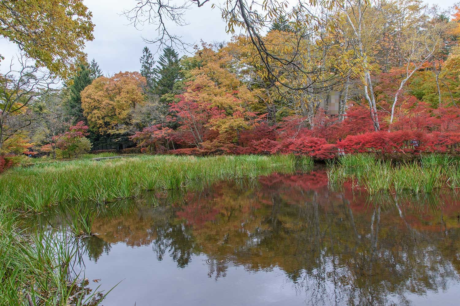 現在、雲場池では紅葉が見ごろをむかえています。例年よりも10日くらいゆっくりと進んでいて、まだ見ごろも始まったばかり。緑、黄、オレンジ、赤の葉が混ざり合い、色彩豊かな景色が広がっています。