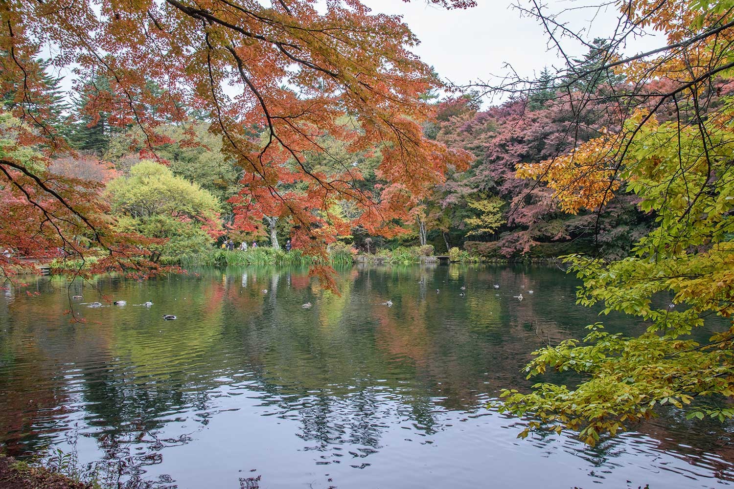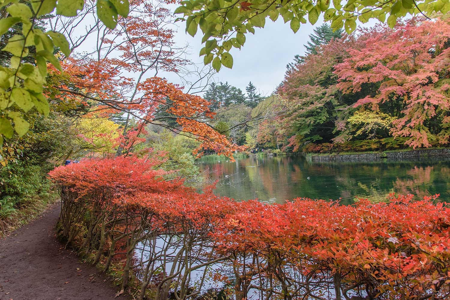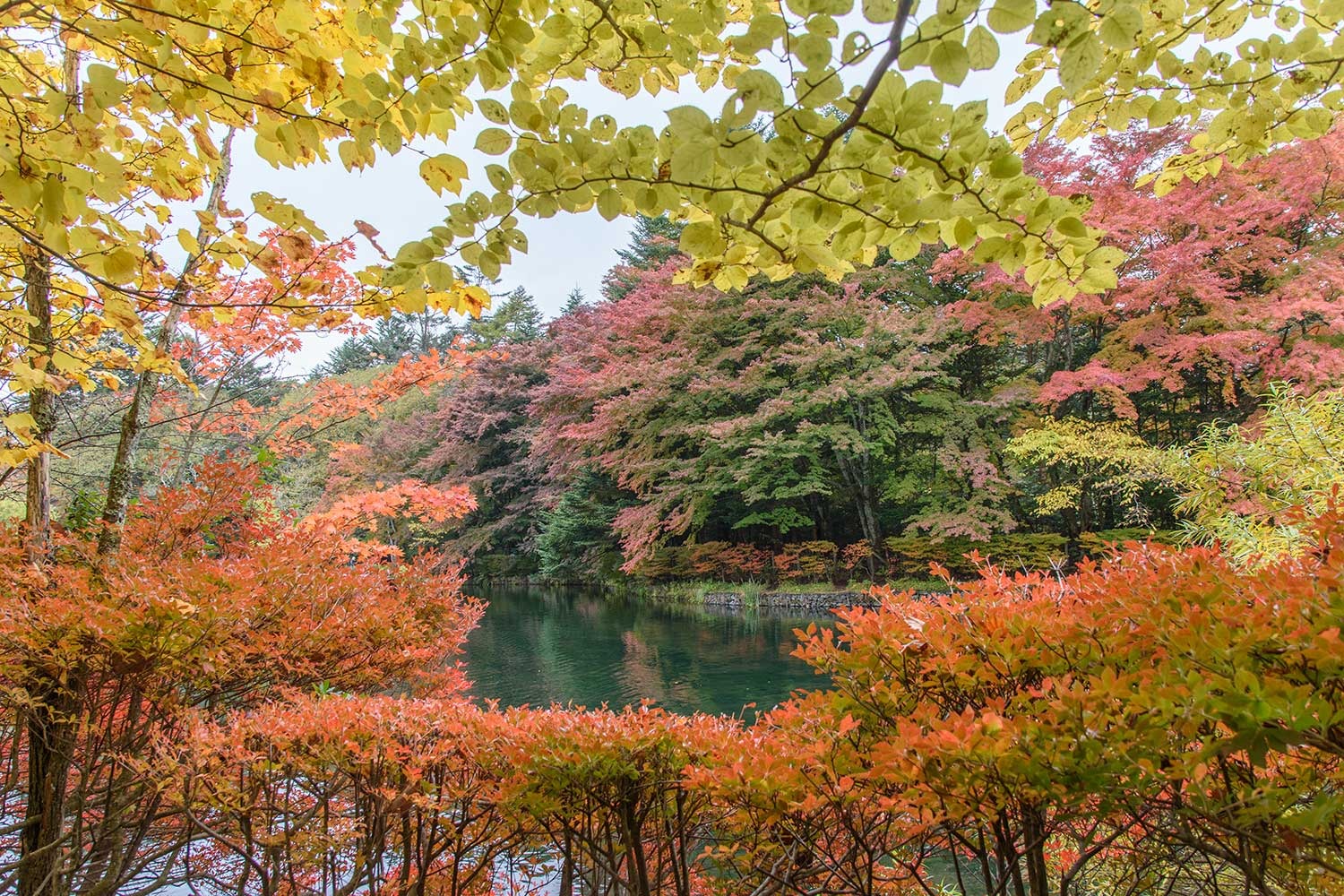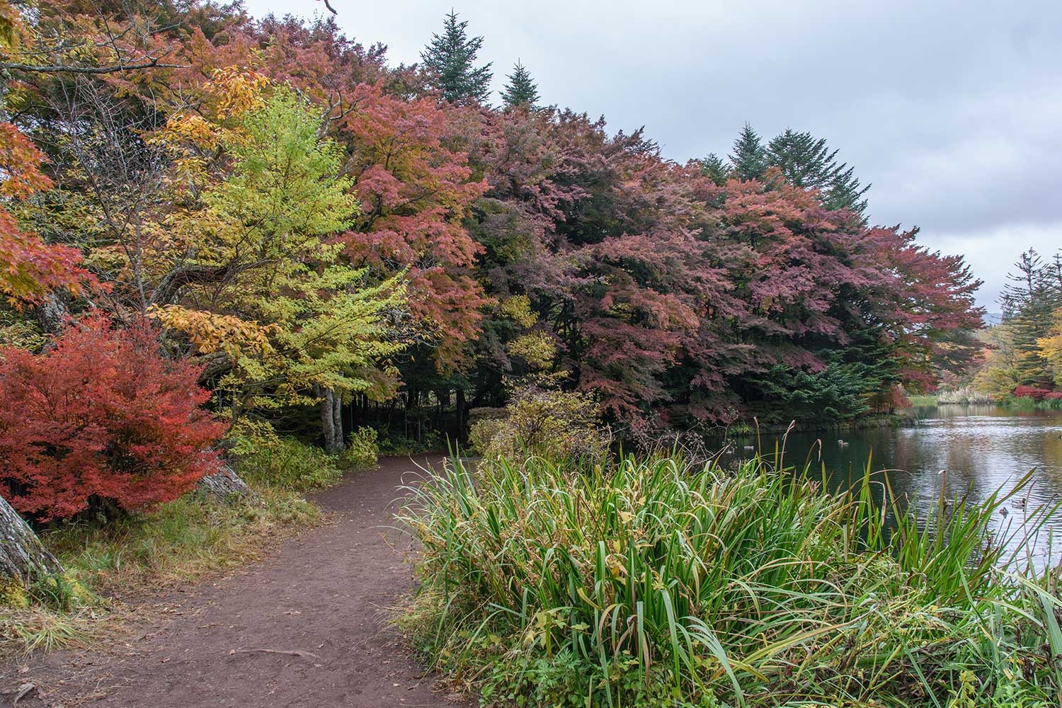 現在、雲場池では紅葉が見ごろをむかえています。例年よりも10日くらいゆっくりと進んでいて、まだ見ごろも始まったばかり。緑、黄、オレンジ、赤の葉が混ざり合い、色彩豊かな景色が広がっています。