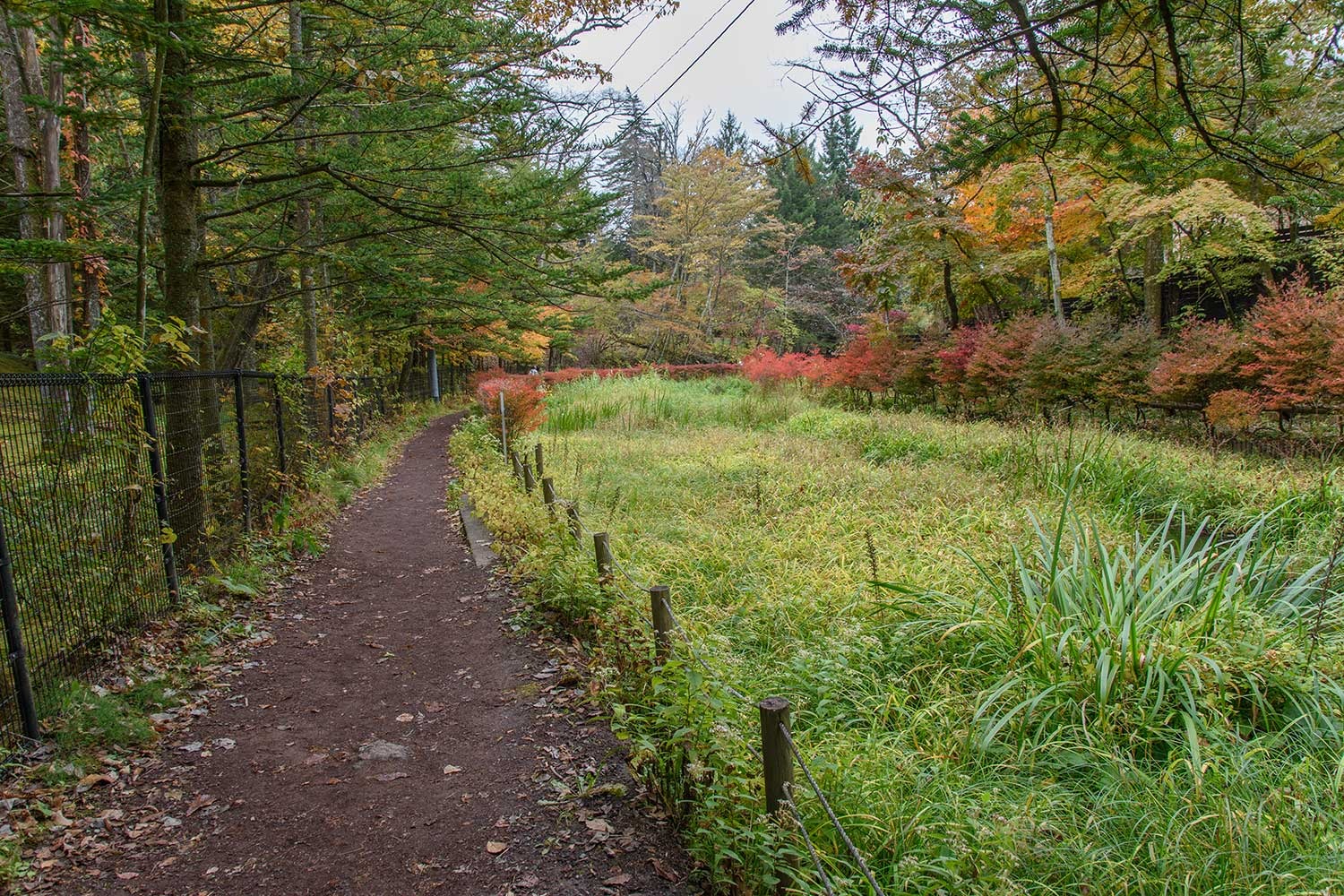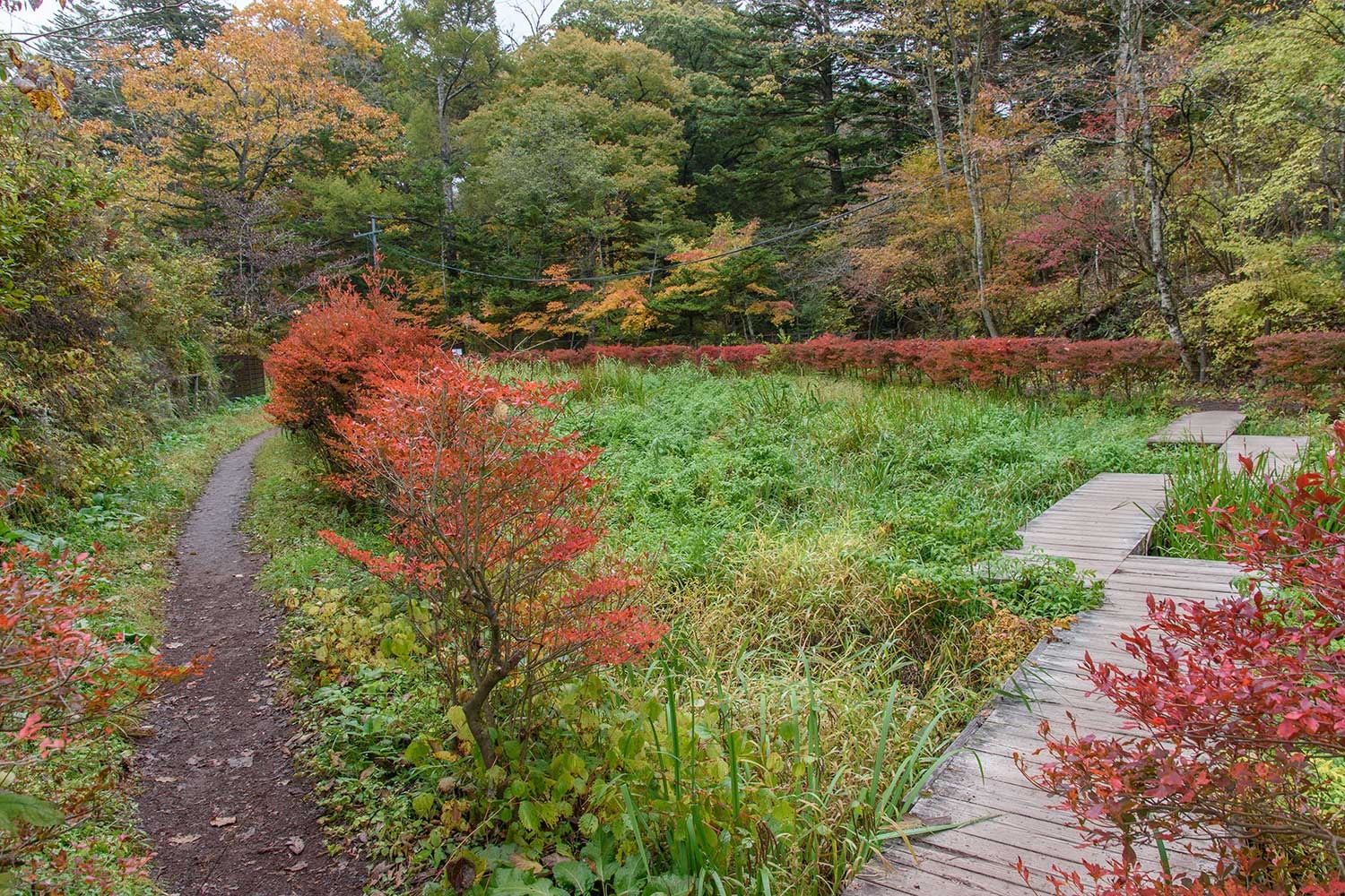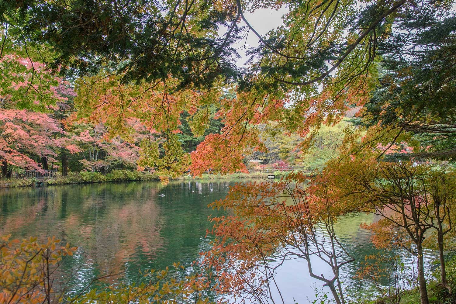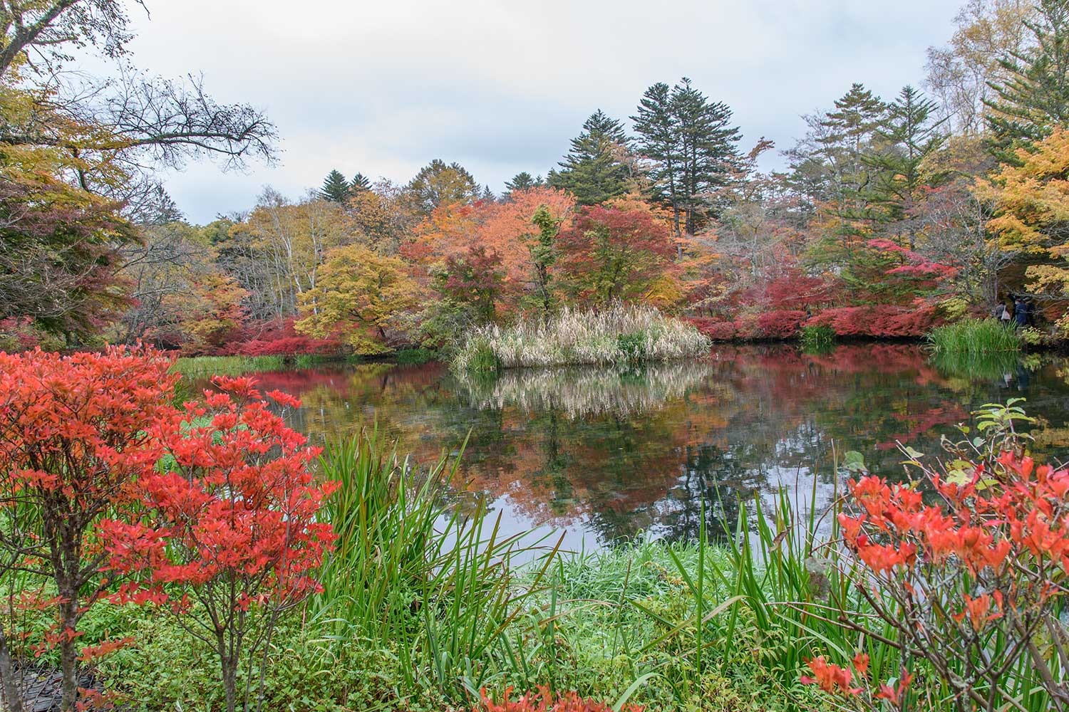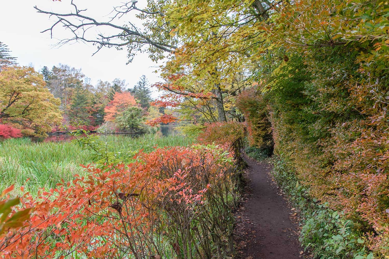 現在、雲場池では紅葉が見ごろをむかえています。例年よりも10日くらいゆっくりと進んでいて、まだ見ごろも始まったばかり。緑、黄、オレンジ、赤の葉が混ざり合い、色彩豊かな景色が広がっています。