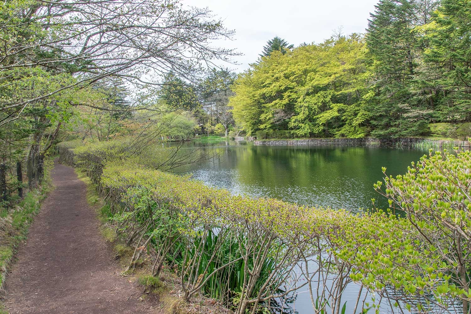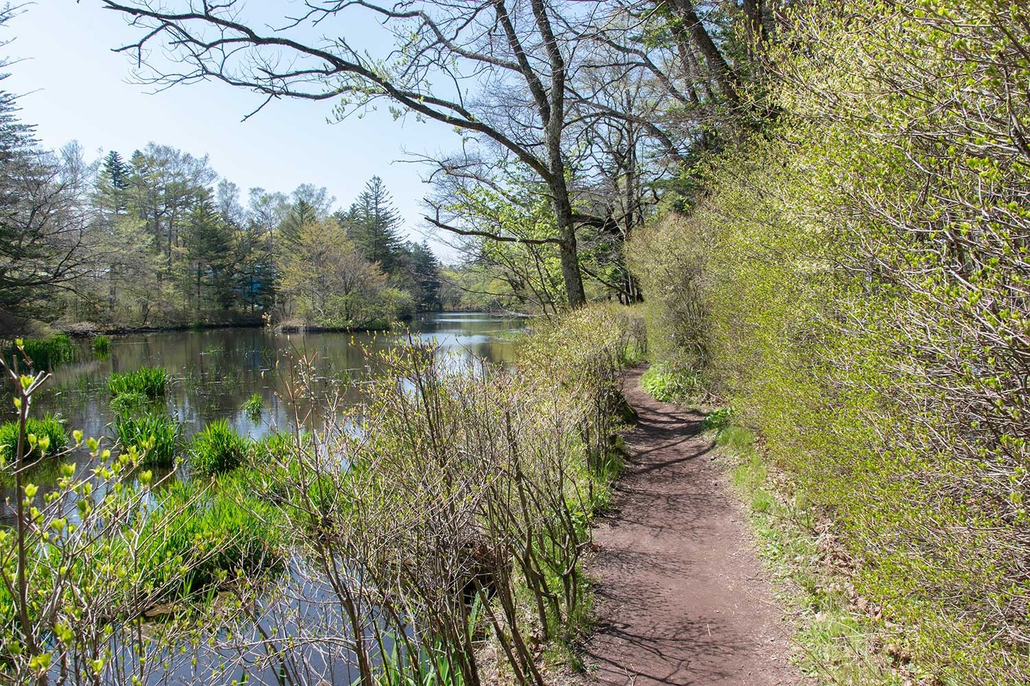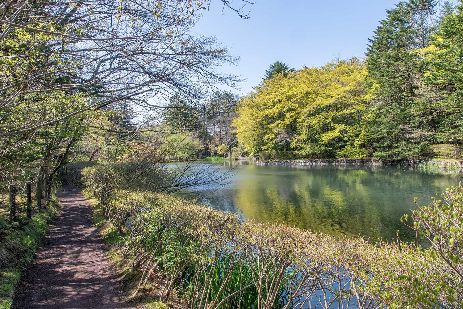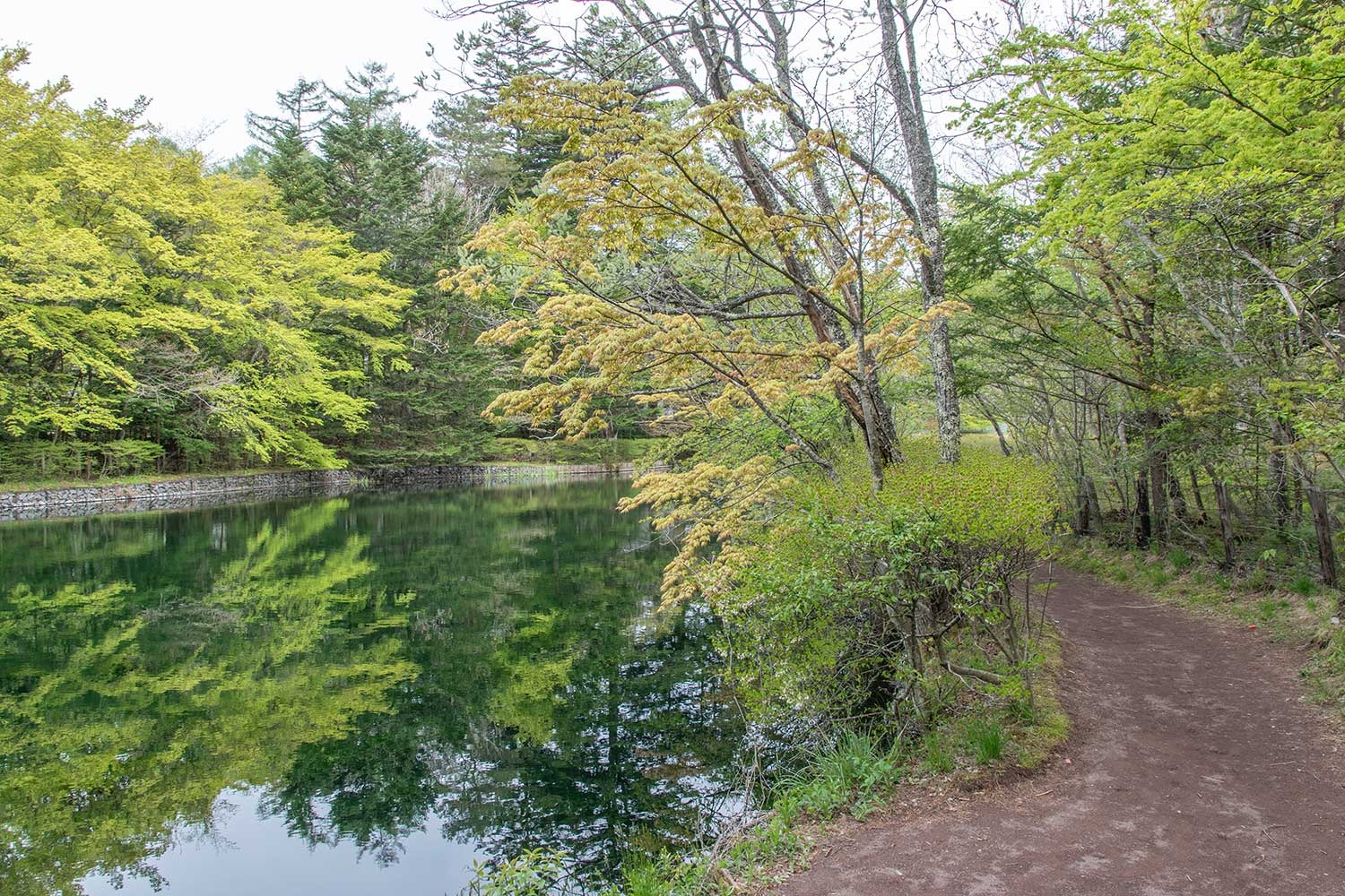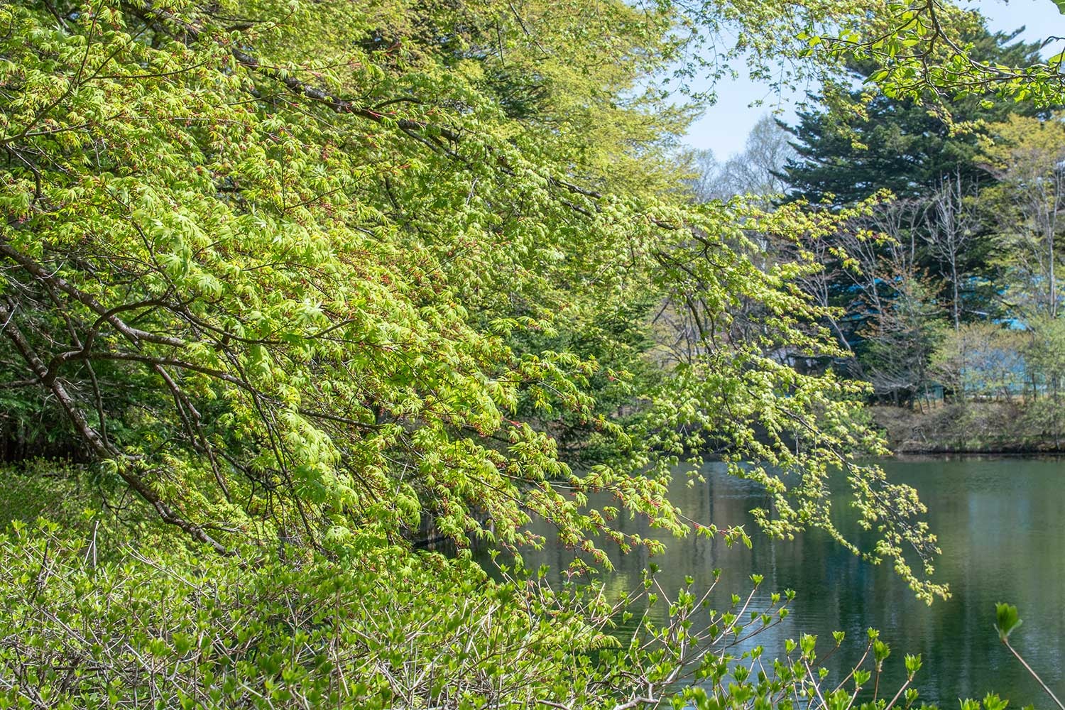 雲場池ではイロハモミジの芽吹きが4月下旬になってから始まり、4月26日ころには景色が萌黄色に染まりました(下写真)。