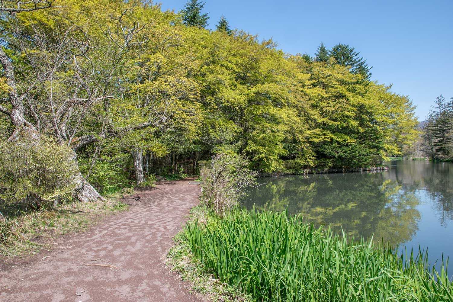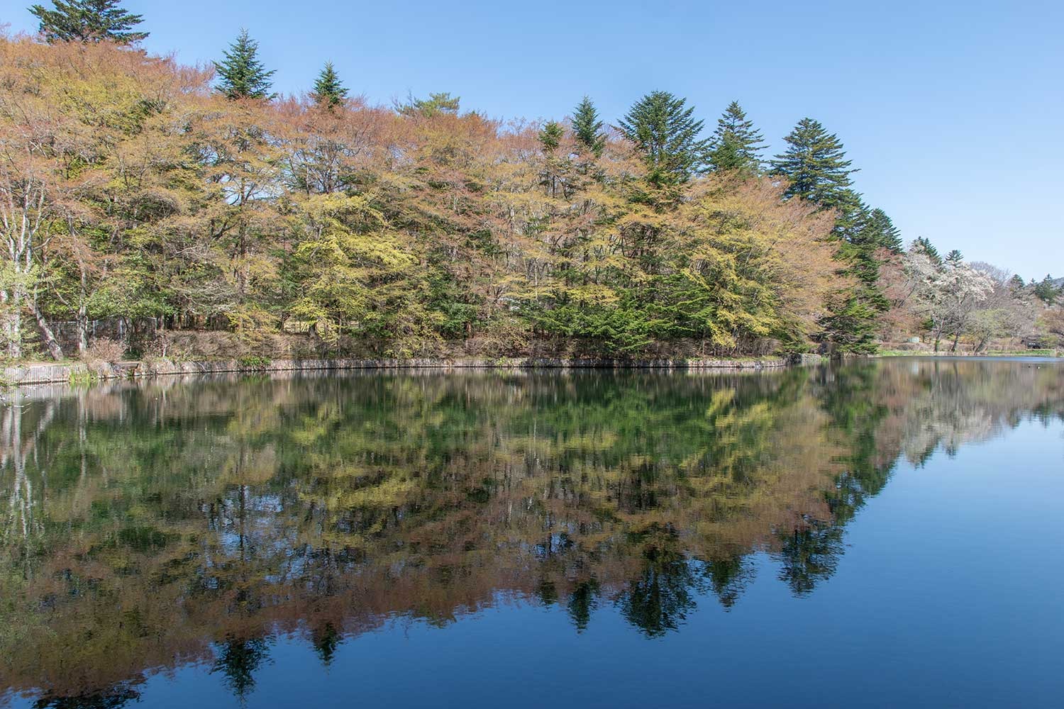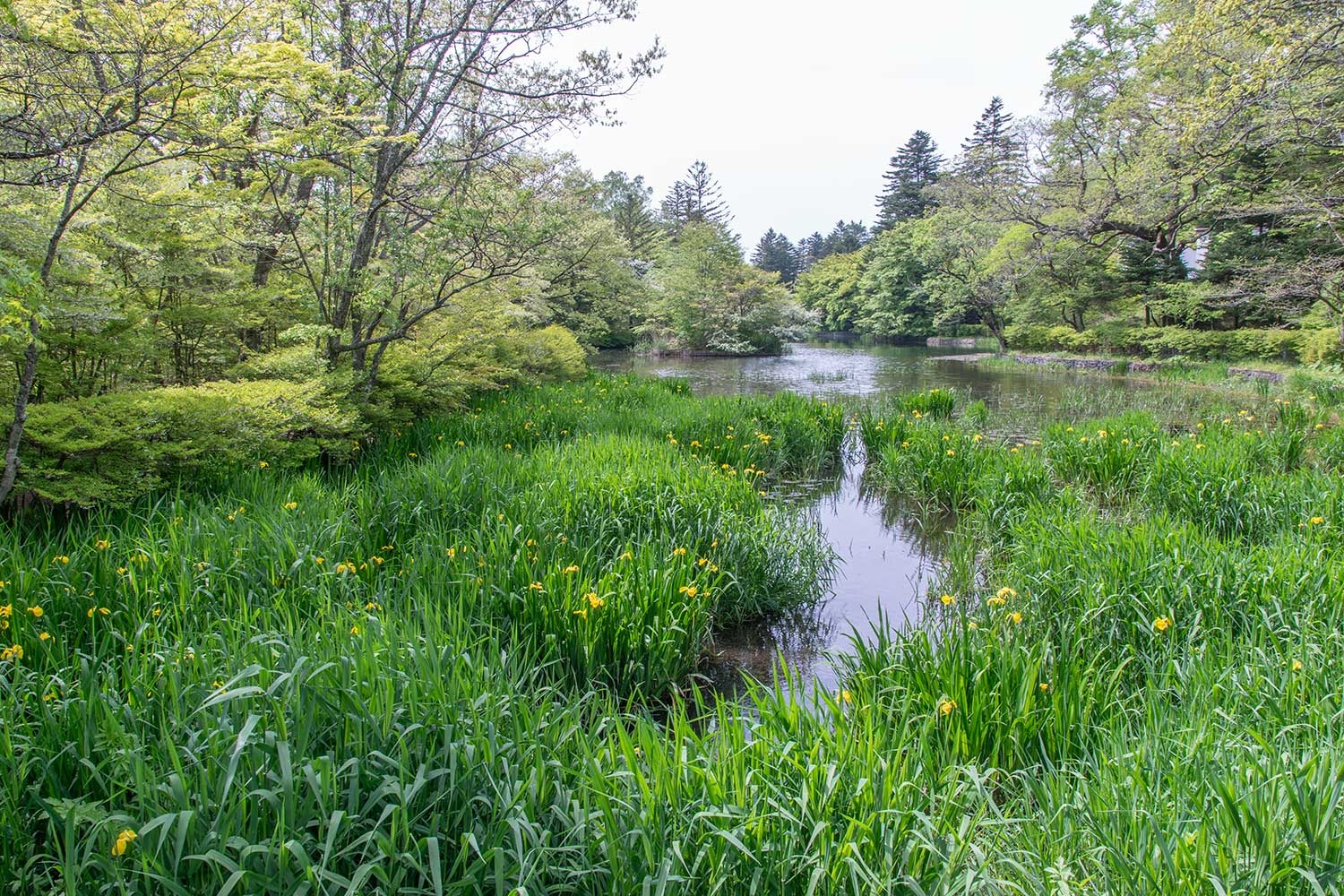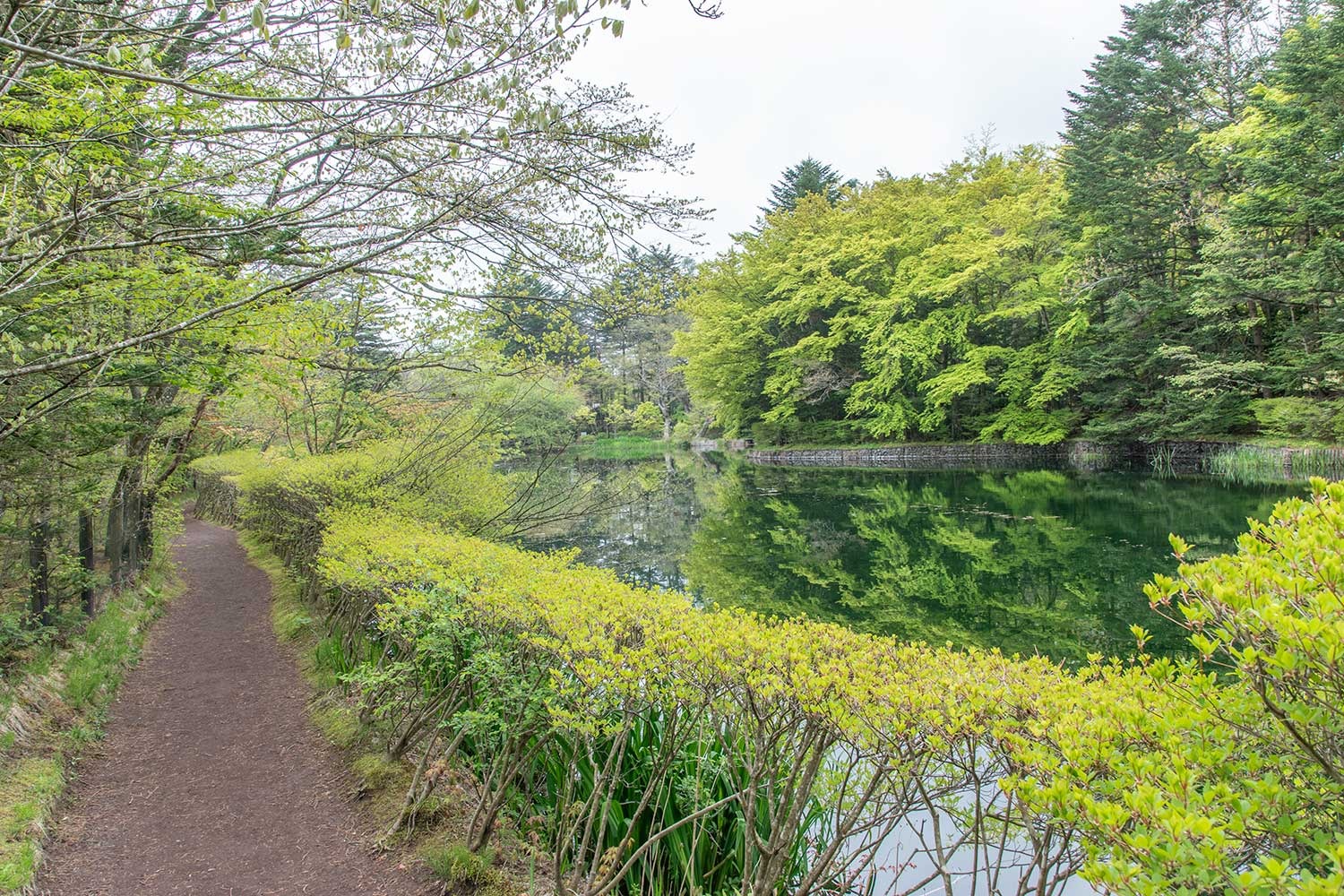 雲場池ではイロハモミジの芽吹きが4月下旬になってから始まり、4月26日ころには景色が萌黄色に染まりました(下写真)。