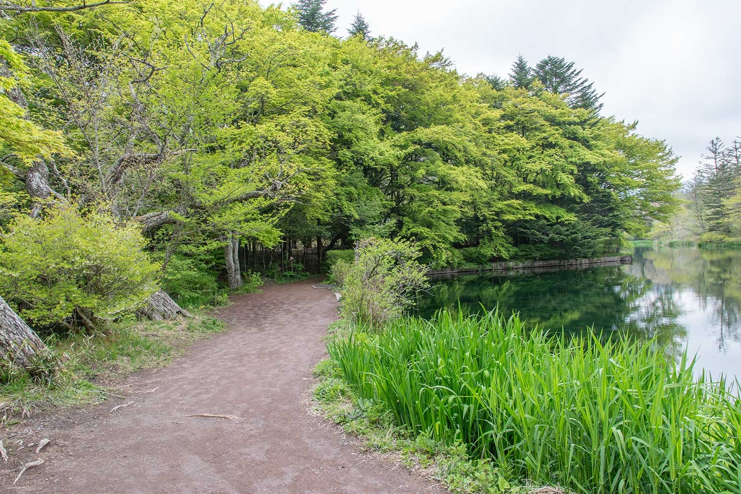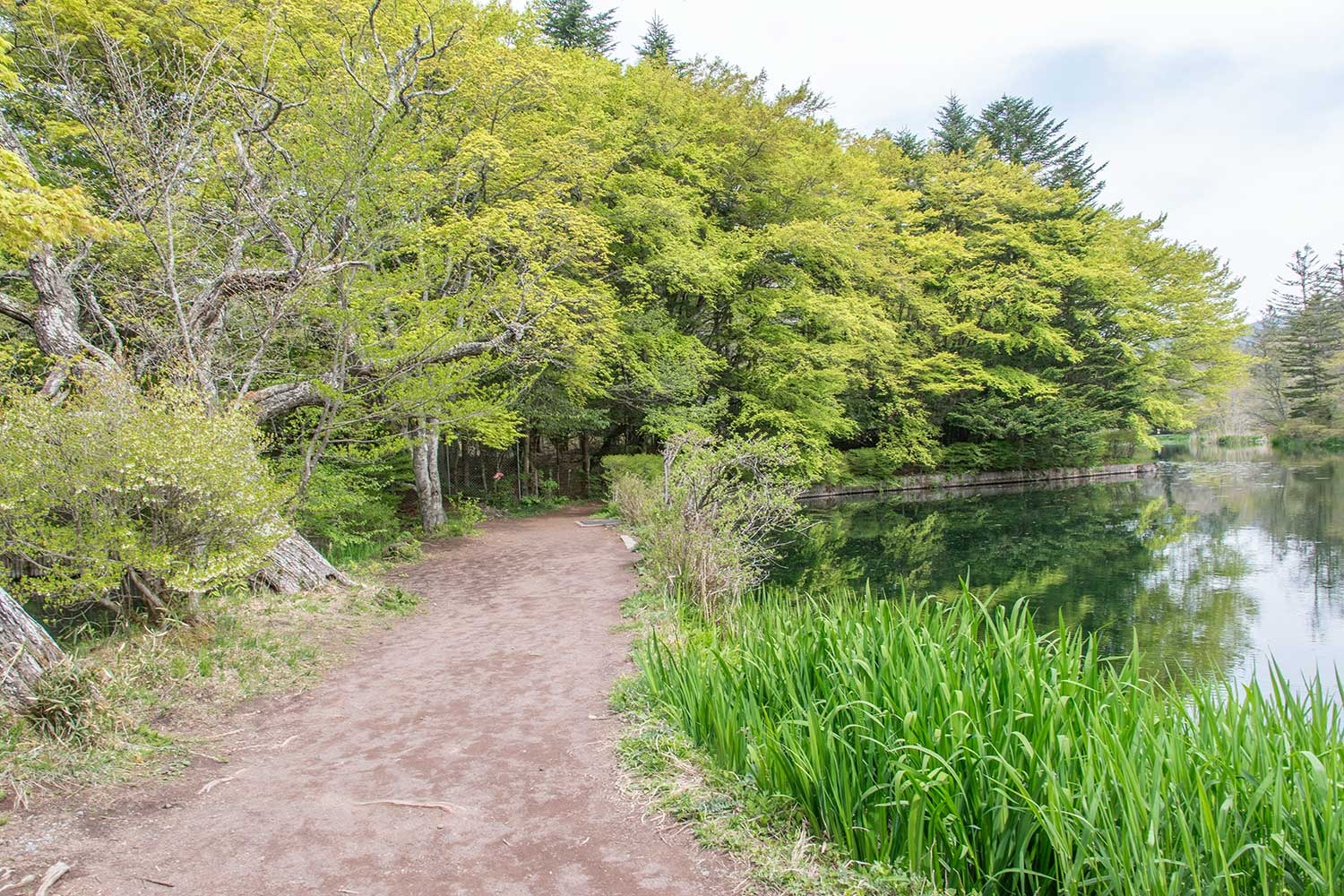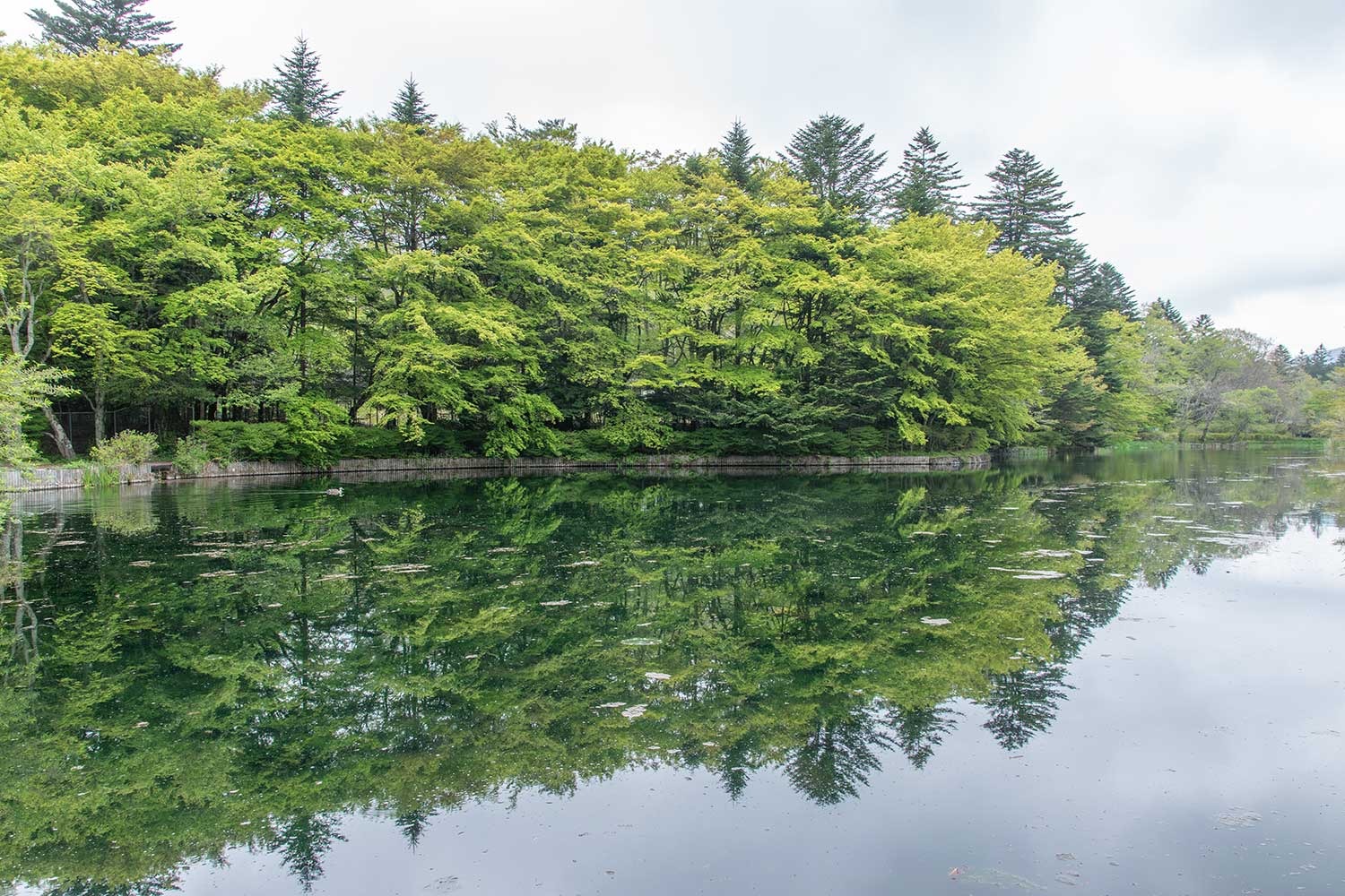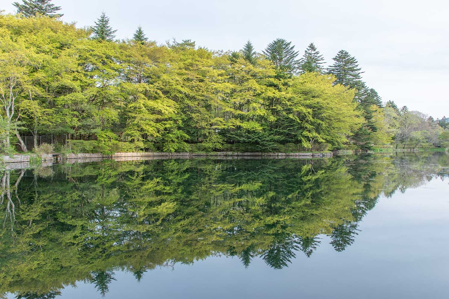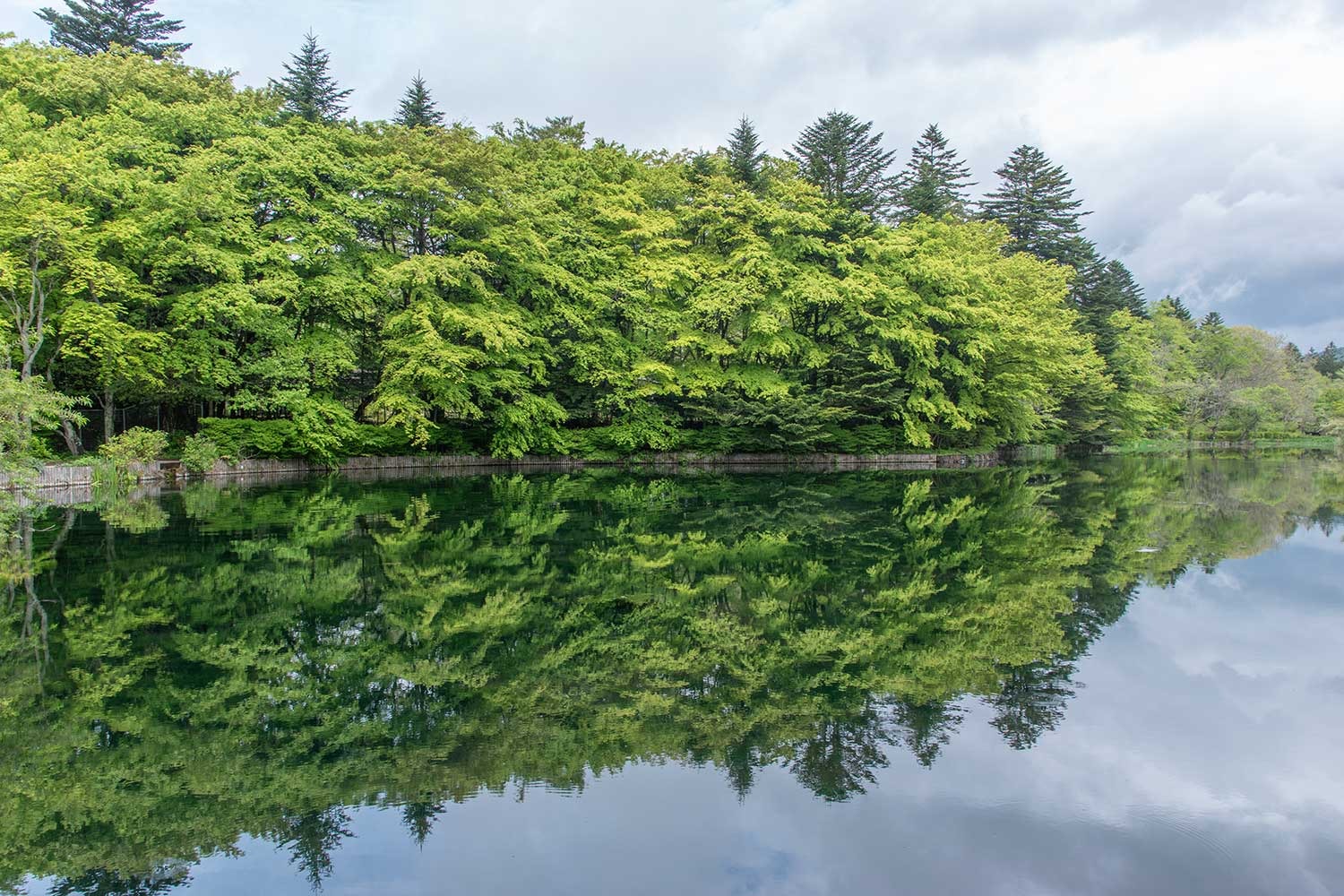 雲場池ではイロハモミジの芽吹きが4月下旬になってから始まり、4月26日ころには景色が萌黄色に染まりました(下写真)。