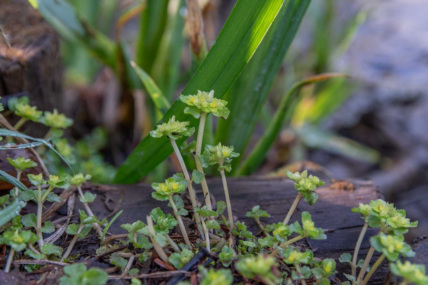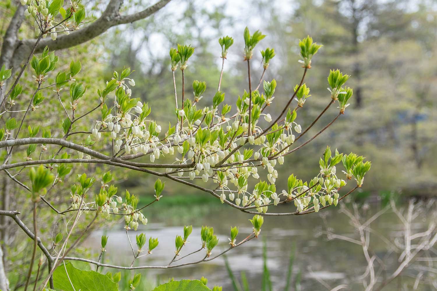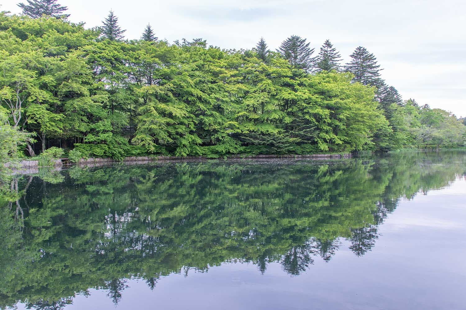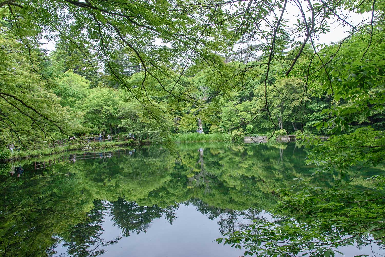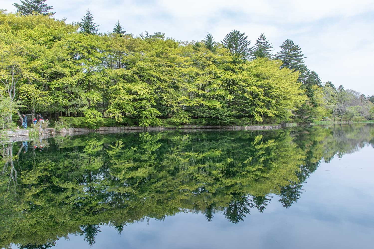 雲場池ではイロハモミジの芽吹きが4月下旬になってから始まり、4月26日ころには景色が萌黄色に染まりました(下写真)。