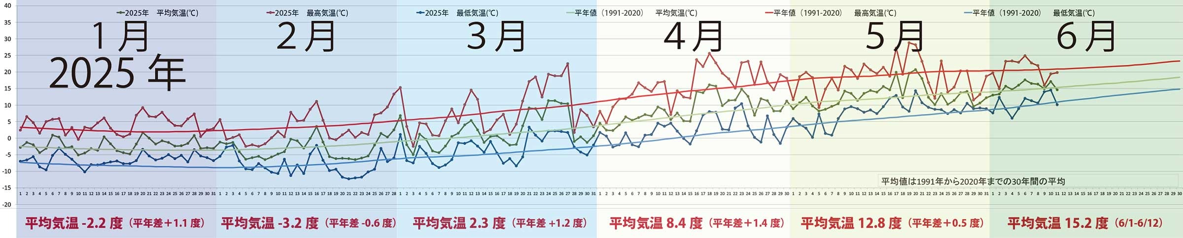 グラフ:2025年1月1日から6月12日までの一日毎の気温の変化 (気象庁HPより軽井沢観測地点のデータ使用)