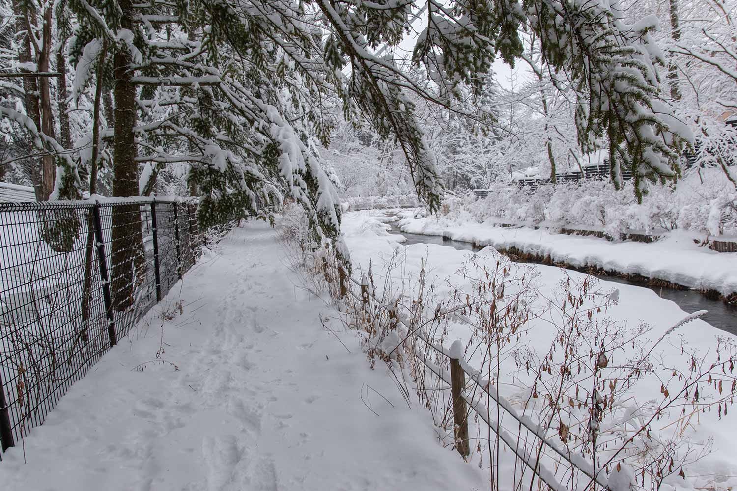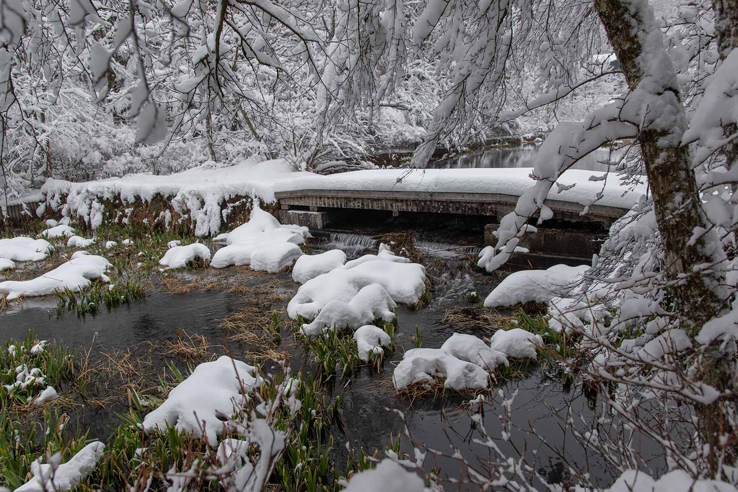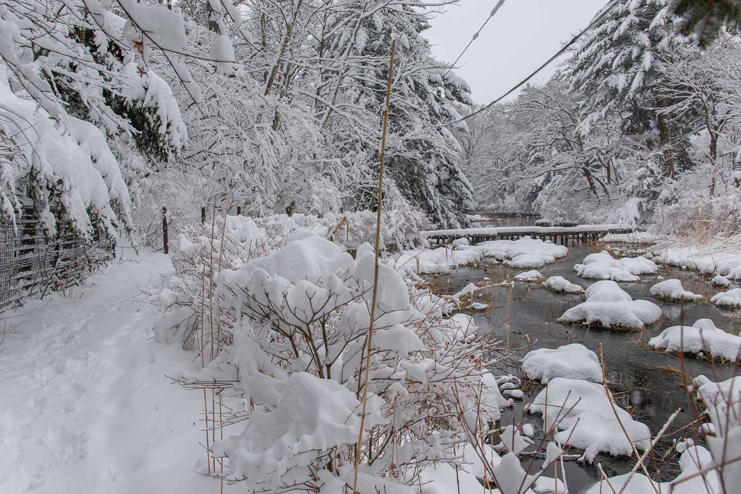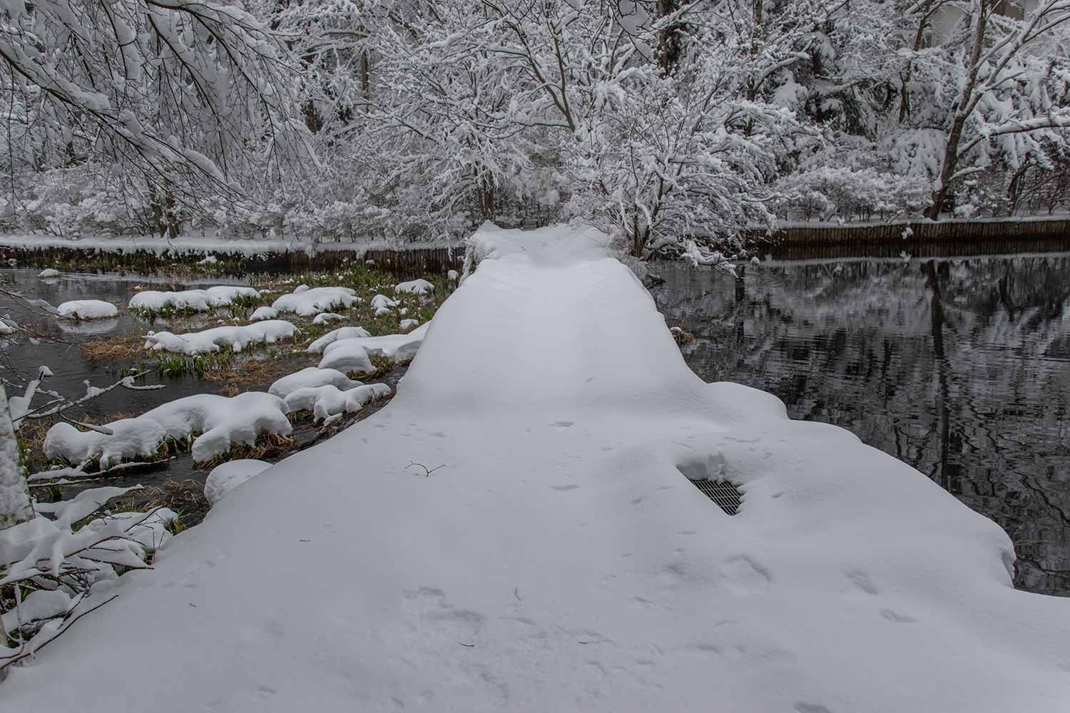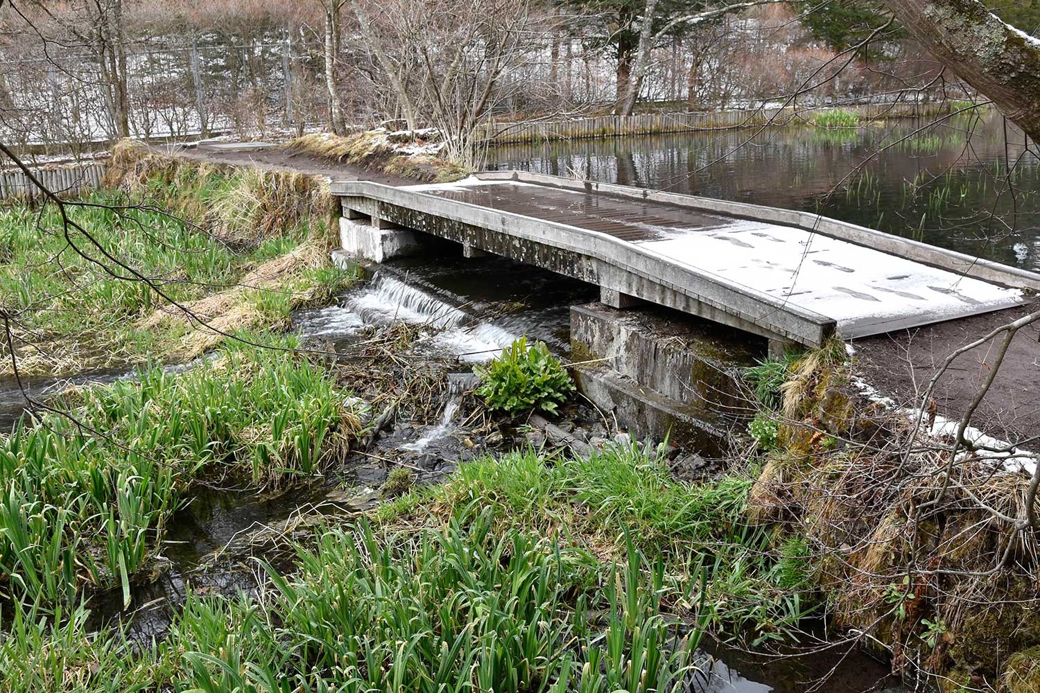 下写真:今季、初めて氷点下の朝となり、木橋が霜で白くなりました。足跡は人とペットの犬