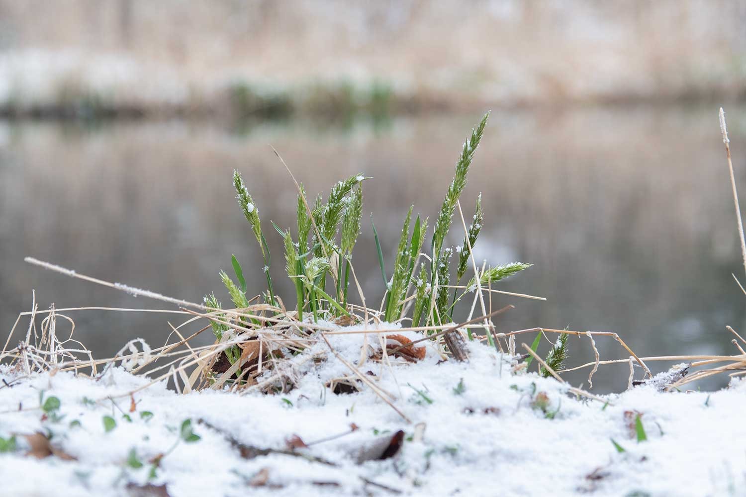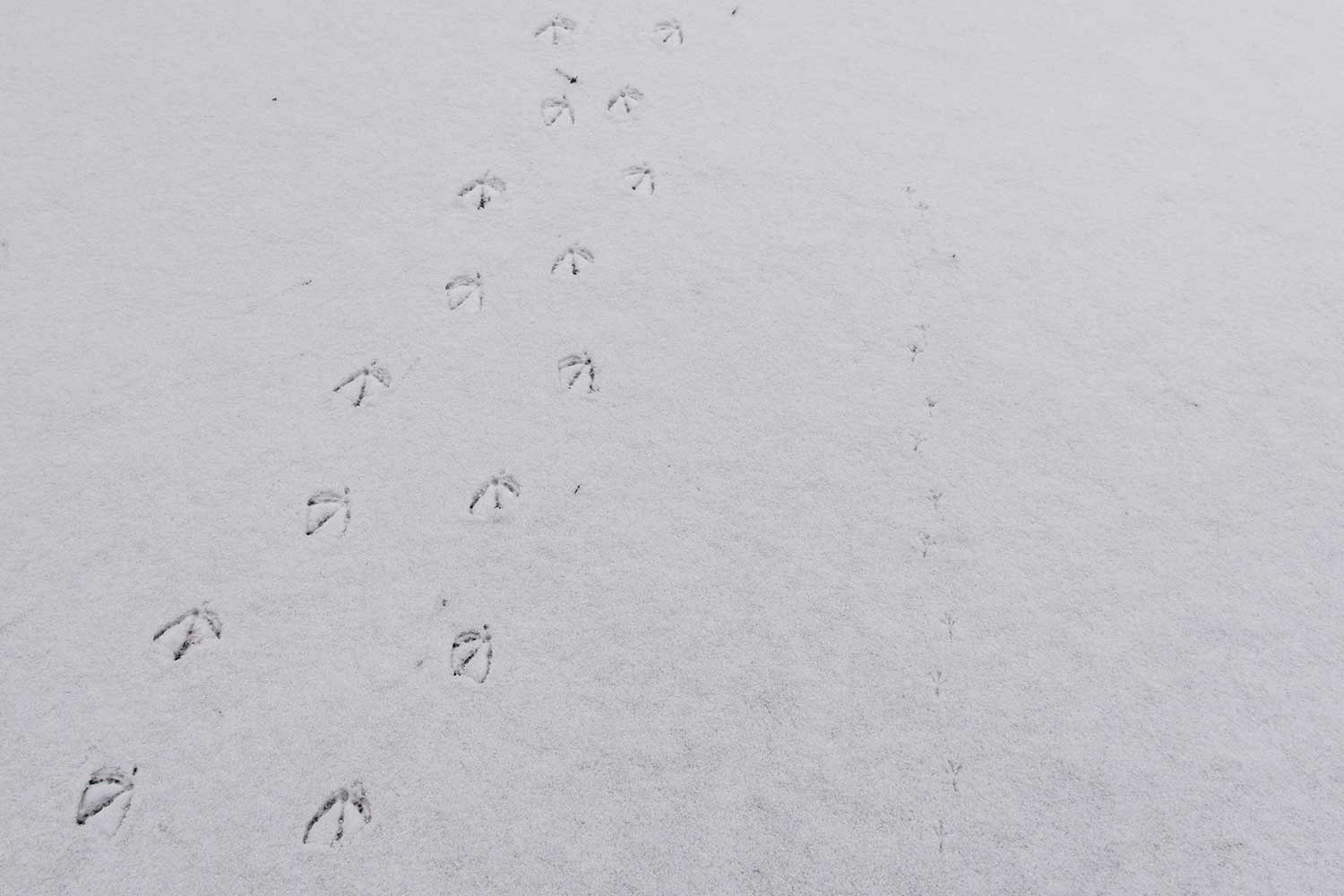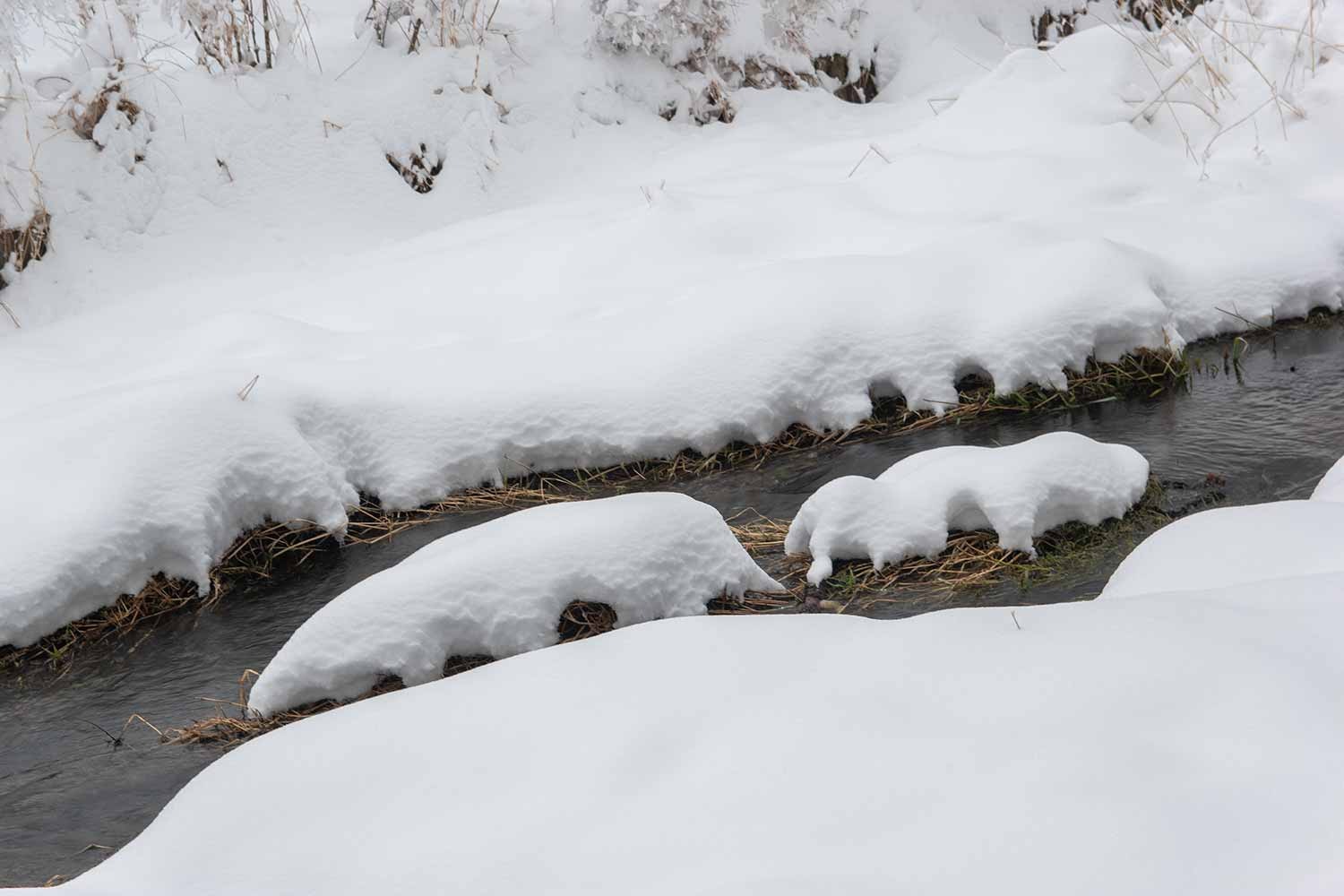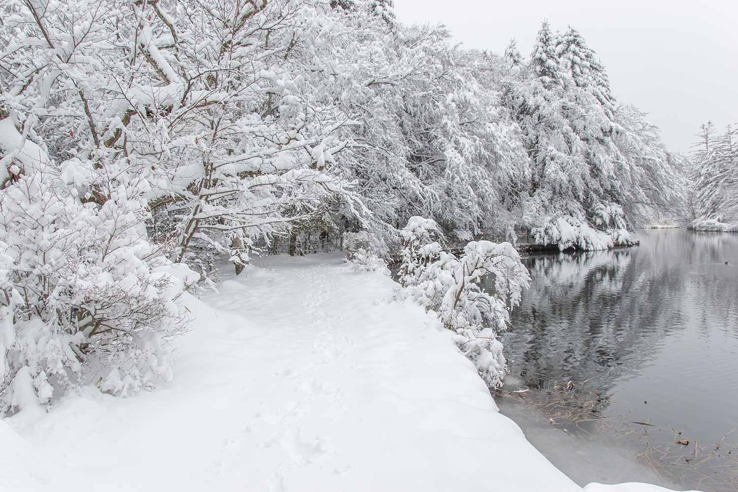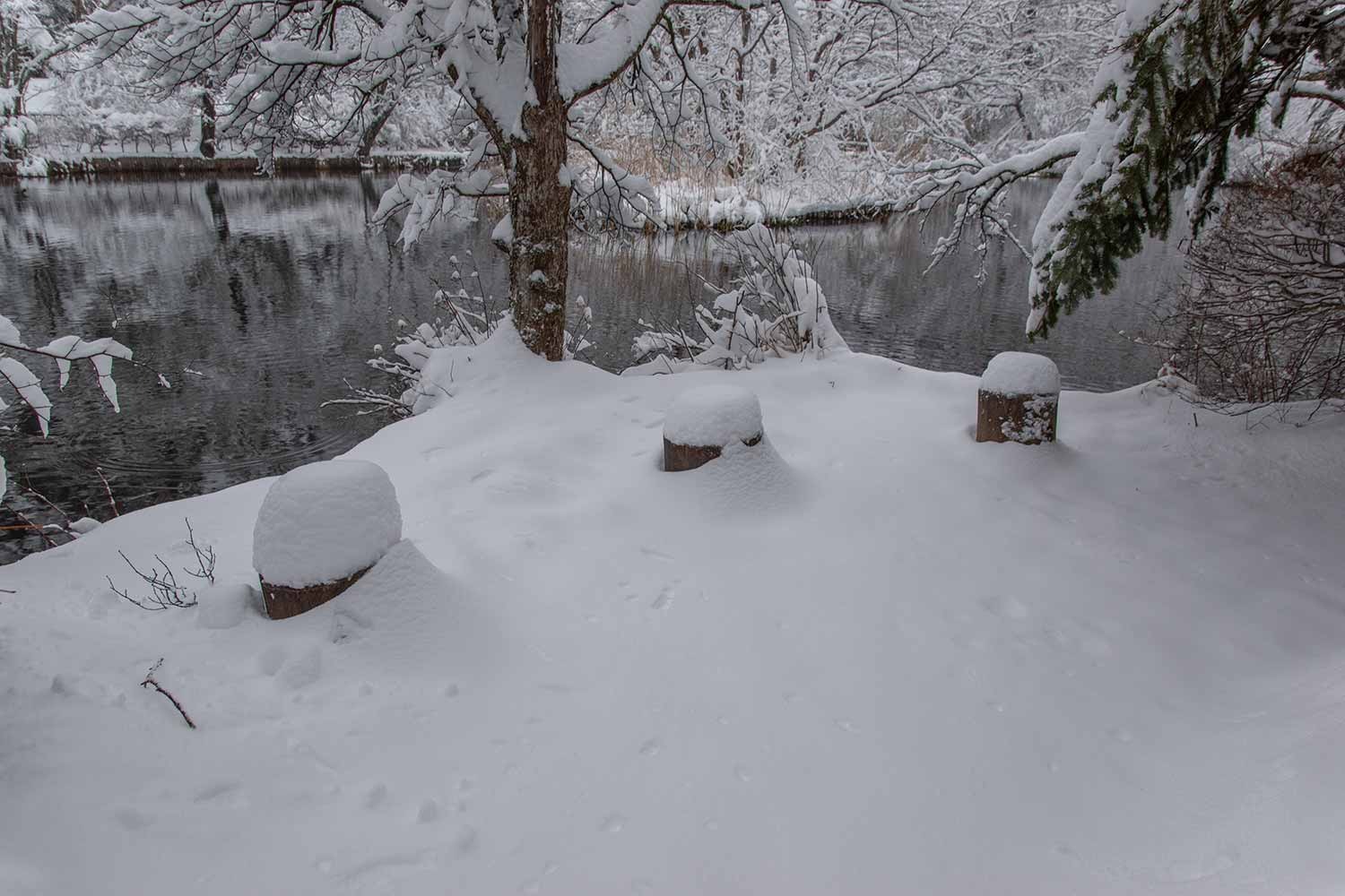 下写真:今季、初めて氷点下の朝となり、木橋が霜で白くなりました。足跡は人とペットの犬